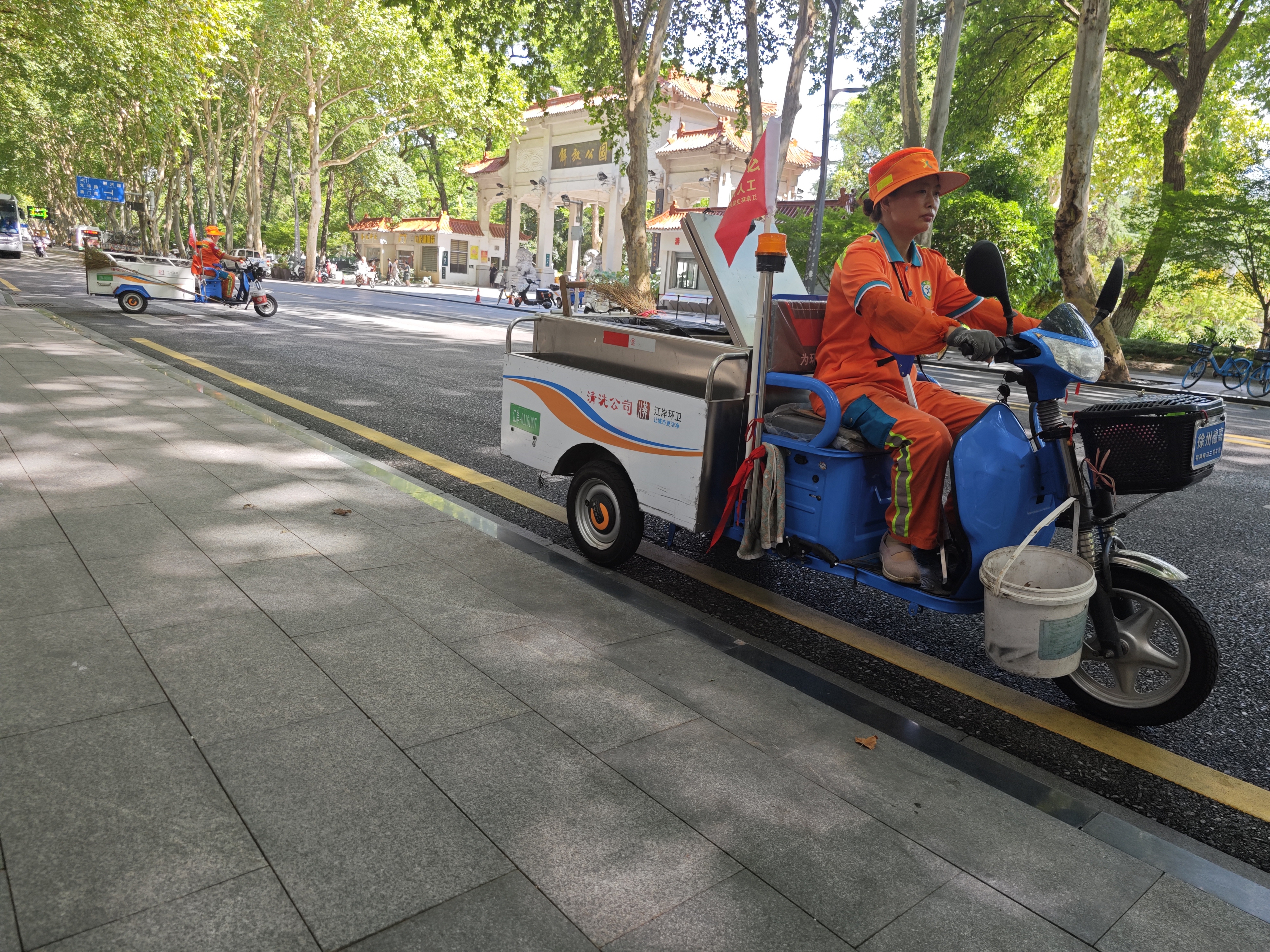 解放公园路上,环卫工人骑行电动保洁作业车进行巡回保洁。