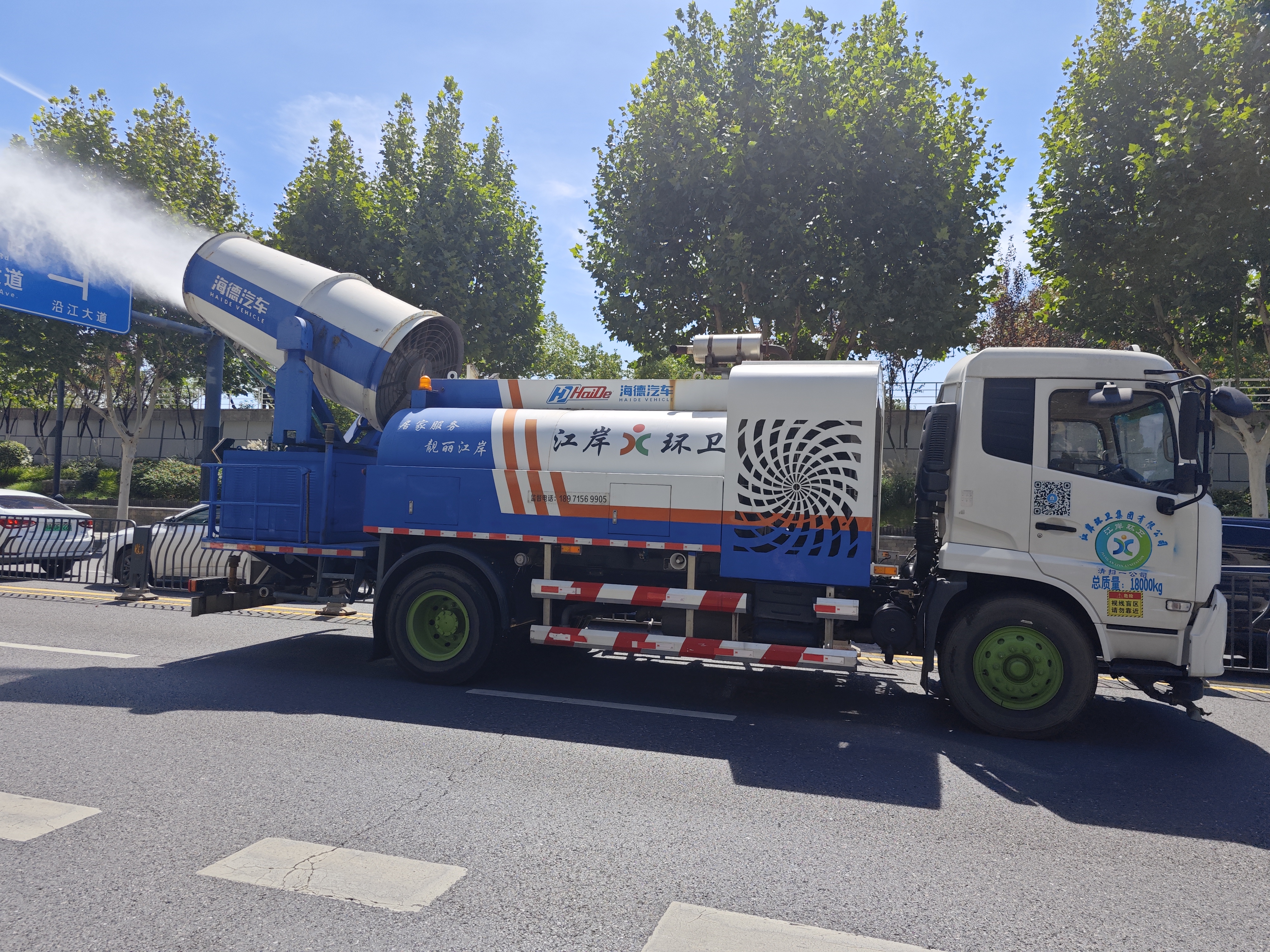当日上午10时,在汉口沿江大道上,记者看到一辆大型环卫车辆尾部架起“大炮筒”,向空中喷出水雾,如同白色长龙缓落于路面。