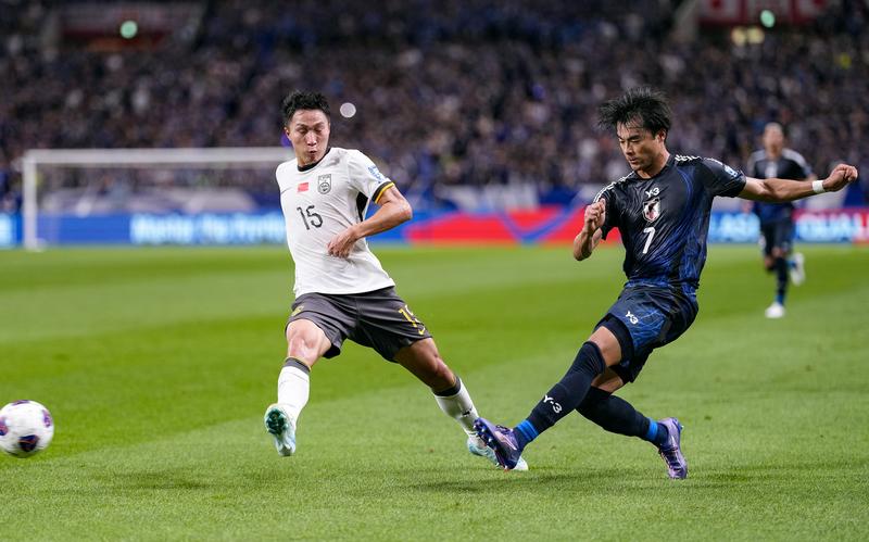 9月5日,中国队球员杨泽翔(左)与日本队球员三笘薰在比赛中拼抢。新华社记者 张笑宇 摄