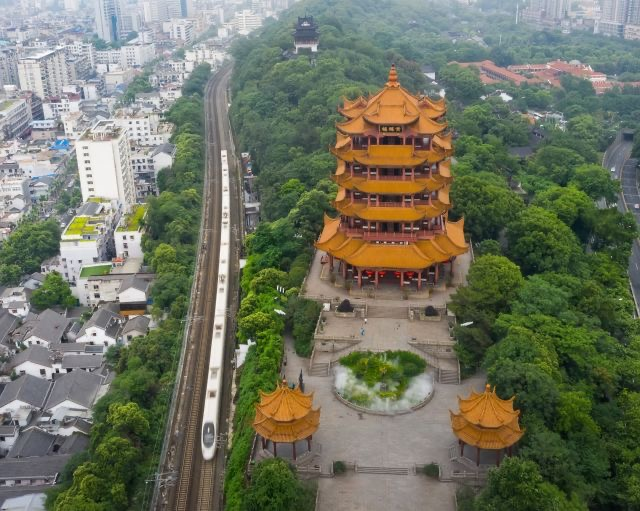 一列高铁从黄鹤楼下驶过