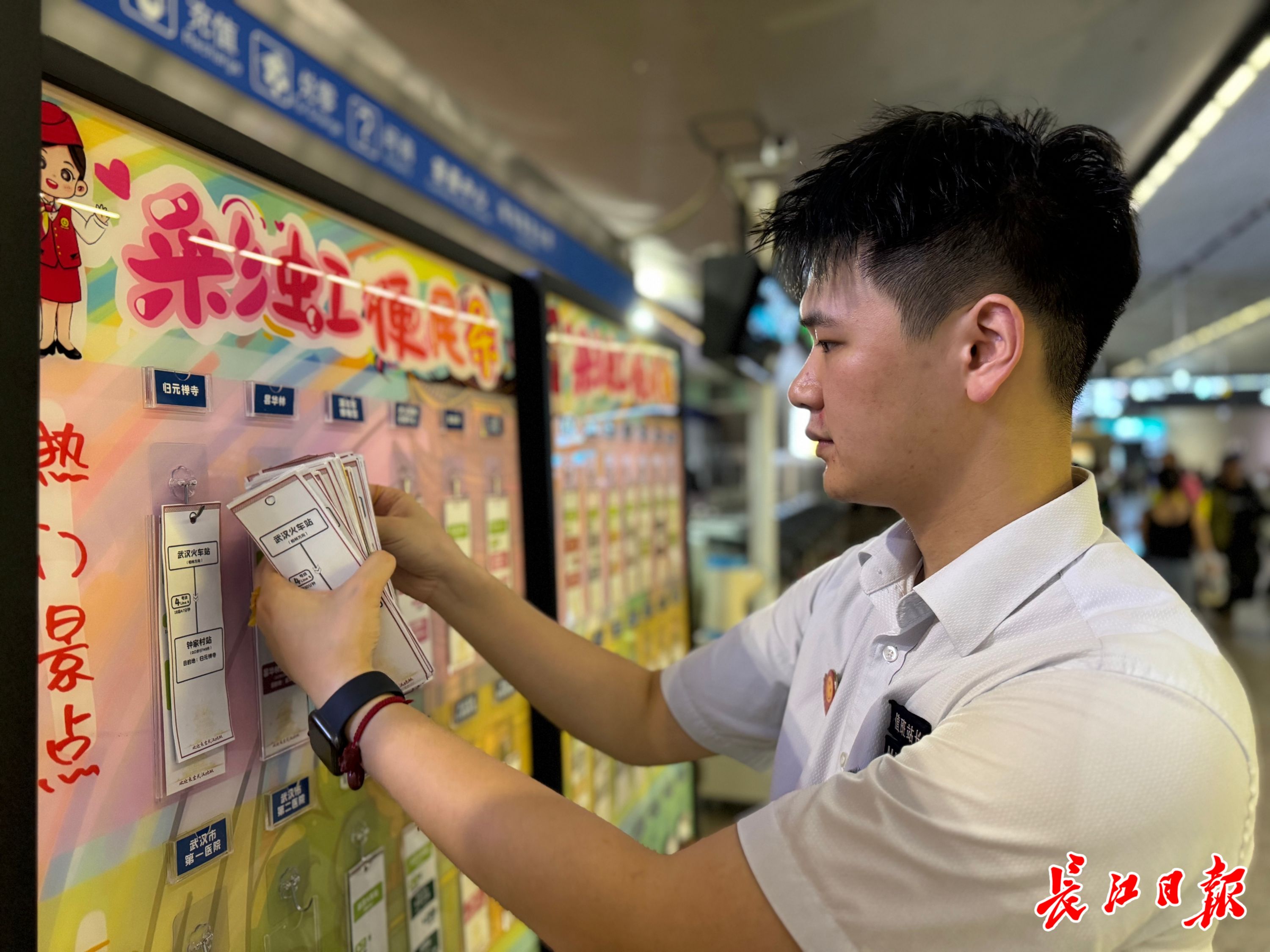 4号线武汉火车站值班站长李毅整理彩虹便民条,乘客需求量较大,需要及时补充。 记者陶常宁 摄
