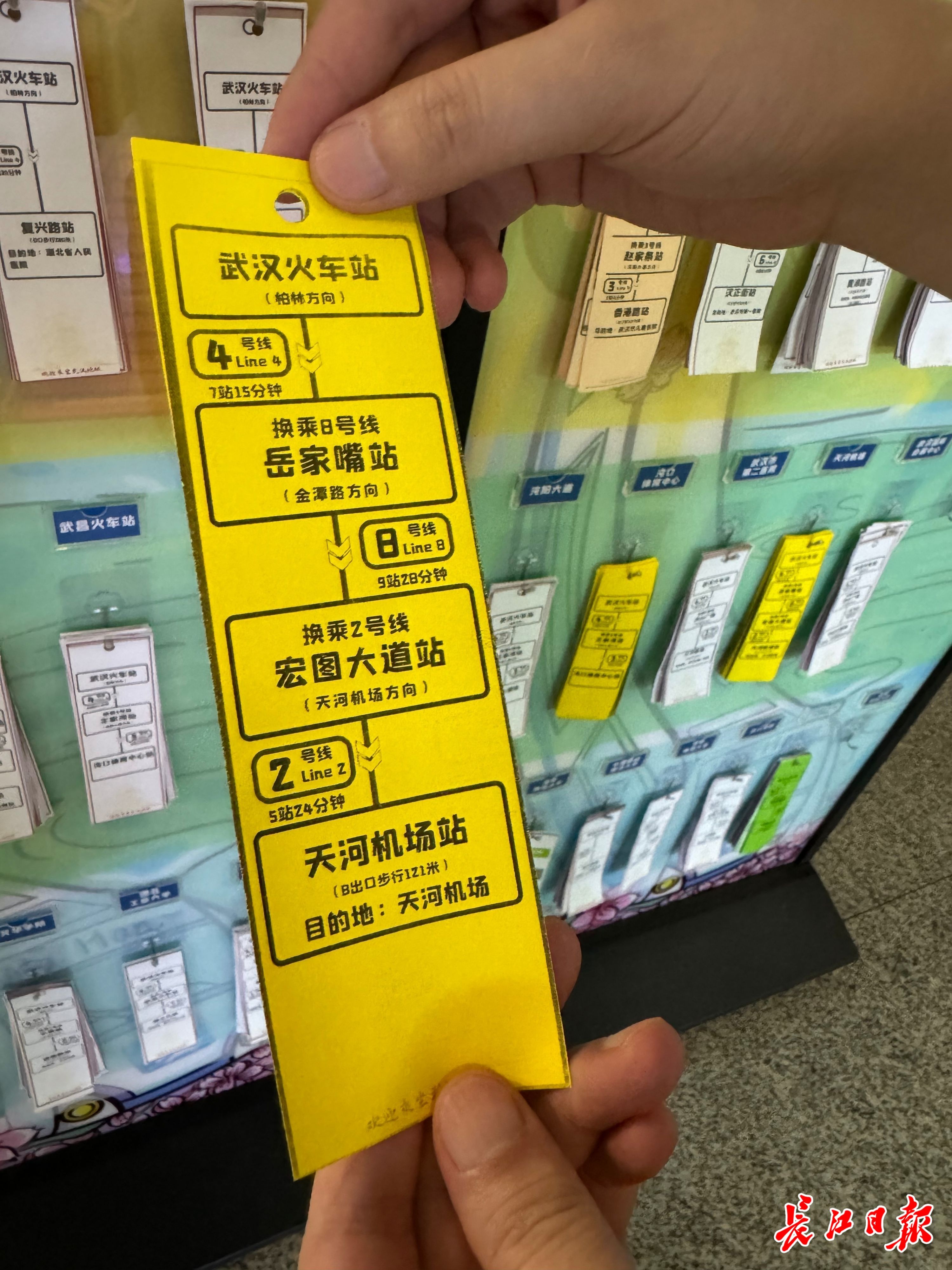 9月6日下午4时许,长江日报记者来到地铁4号线武汉火车站,只见车站客服中心旁边竖立2块约1人高的立板,上面写有“天河机场”“黄鹤楼”“江汉路步行街”“武汉大学”等50余个目的地,每个目的地的下方挂着一沓小纸条。上前仔细一看,每一张纸条都写有换乘路径、多少站、多少分钟到达。