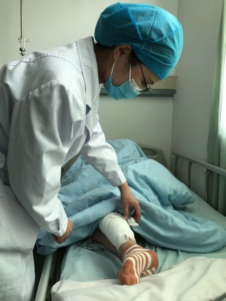 医生正在检查雷女士的伤口。通讯员陈舒 摄