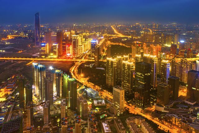 5月20日晚7时,从空中俯瞰武汉金融街及泛海片,华灯齐放,华宇生辉,车水马龙,一派繁华景象。