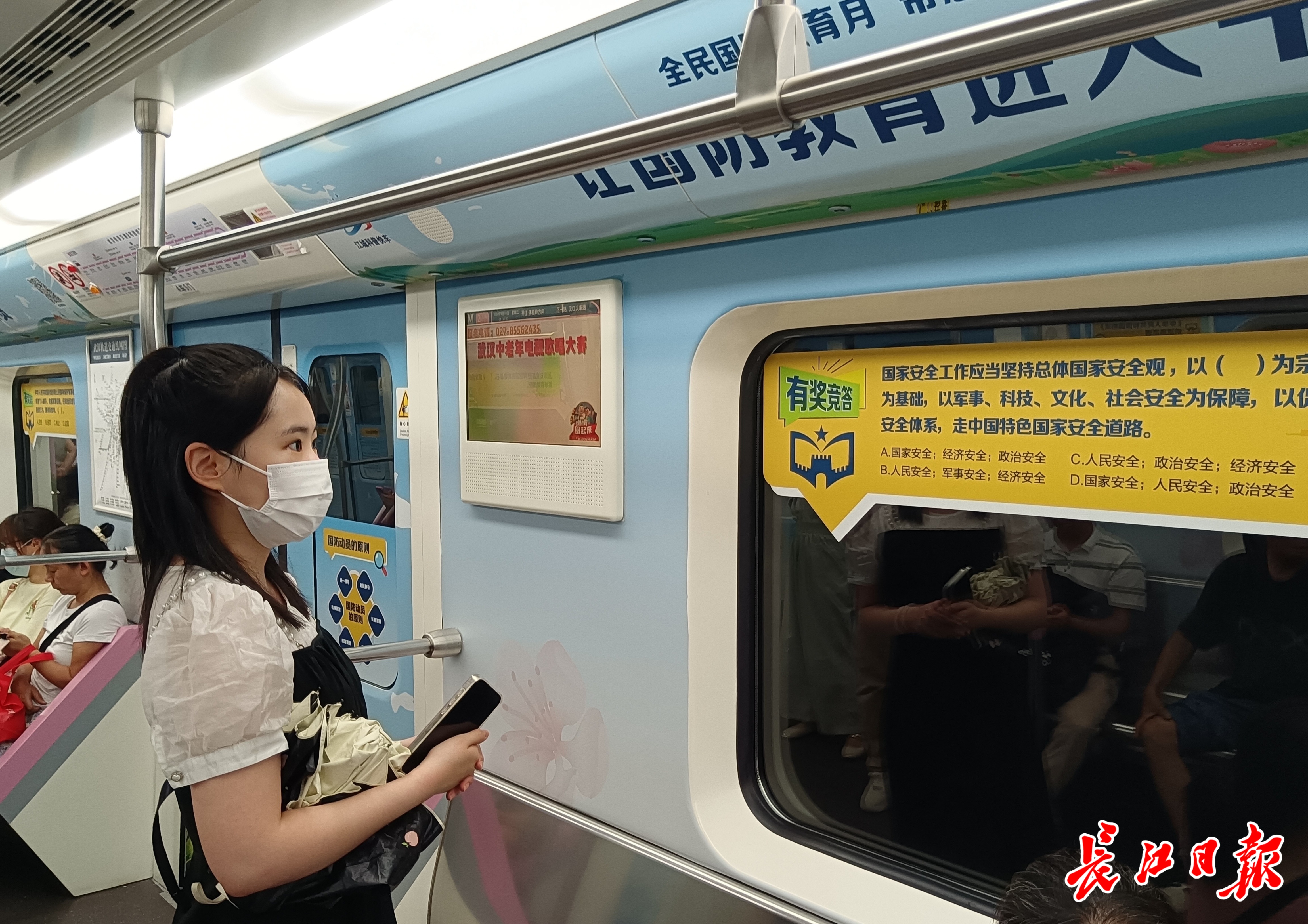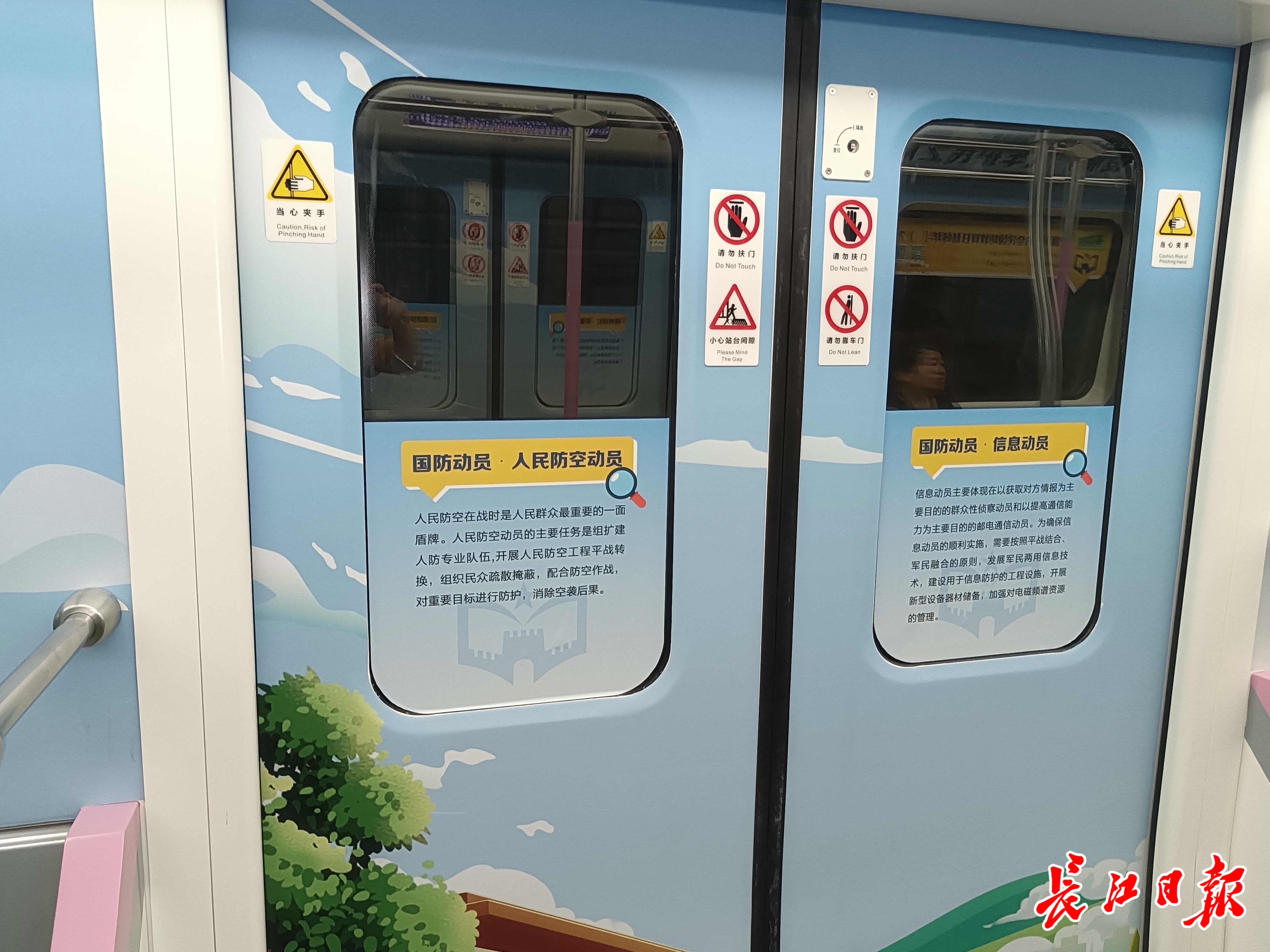 “全民国防教育月,带您了解什么是国防动员”“让国防教育进入千家万户”……9月10日上午,家住武汉市东西湖区的市民张汉桥从地铁2号线金银潭站进入一辆地铁列车时,惊喜地看到,车厢内粘贴有与国防动员有关的宣传标语、海报;车厢中的电视屏上,还在滚动播出与“国防动员”和“军事设施保护”内容相关的视频宣传短片。原来,他有幸乘坐上了当天开通的“国防号”主题地铁专列。