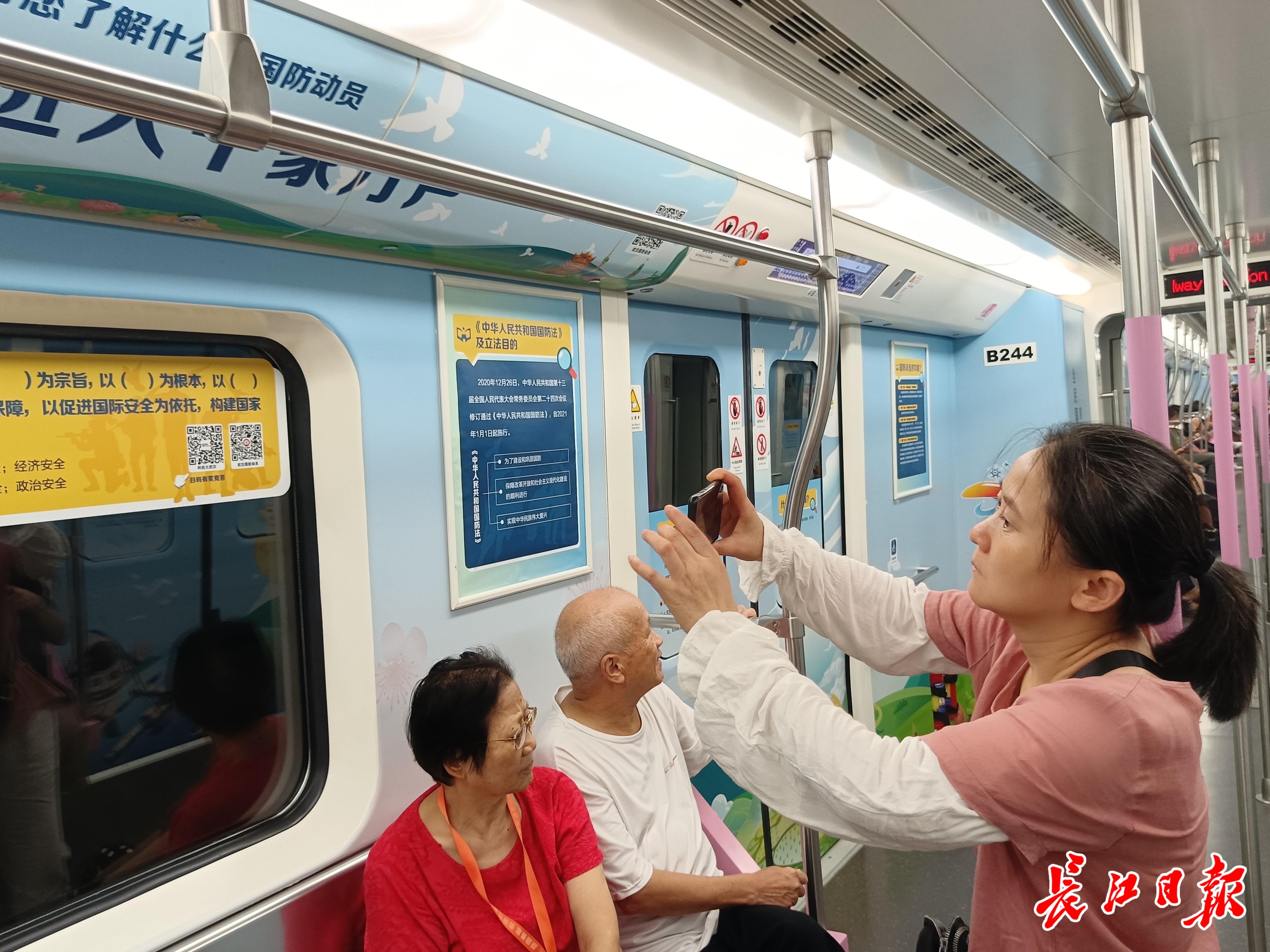 当天,长江日报记者走进“国防号”地铁专列看到,乘客目光所及之处,张贴有武汉市国防动员办公室精心设计的国防动员内容的系列创意海报和标语。这些标语和海报格外引人注目,有不少乘客聚精会神地盯着标语和海报看,还有乘客举起手机扫描标语或海报上的二维码,参加武汉市国防动员办公室主办的国防动员知识有奖竞答活动。答对问题的乘客,有机会获得奖品。