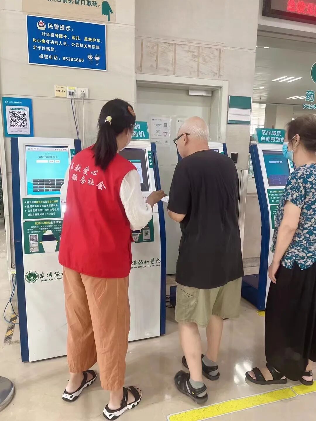 得知他需要为自己和老伴取药,我立即接过他手中的单据,耐心地引导他来到自助机前,一边操作一边详细解释每一步流程:“大爷,您看,先用您的挂号扫这里,接下来是输入您的信息……”就这样,老爷爷从最初的生疏逐渐变得熟练起来,过程中我们还聊起了家常。老爷爷说,老伴身患胃癌,而孩子们又不在身边,每次来医院都感到很多不便。我安慰他说:“大爷,以后您有需要帮忙的地方,就找这里的志愿者,大家都会尽力帮助您的。”