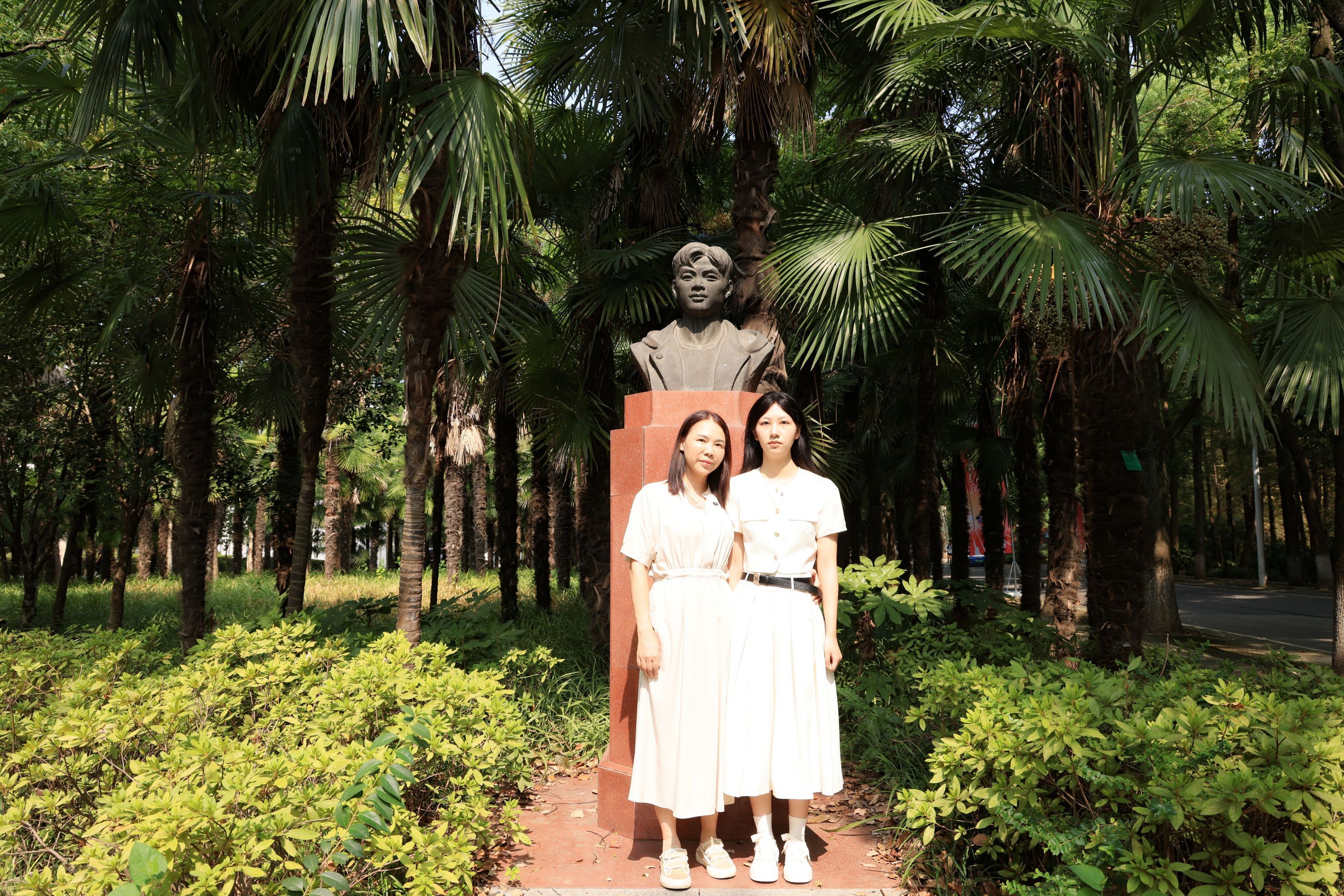 湖工大开学,萧惜花和女儿萧水寒(右)在萧栋栋的雕塑前留影。李雄风 摄