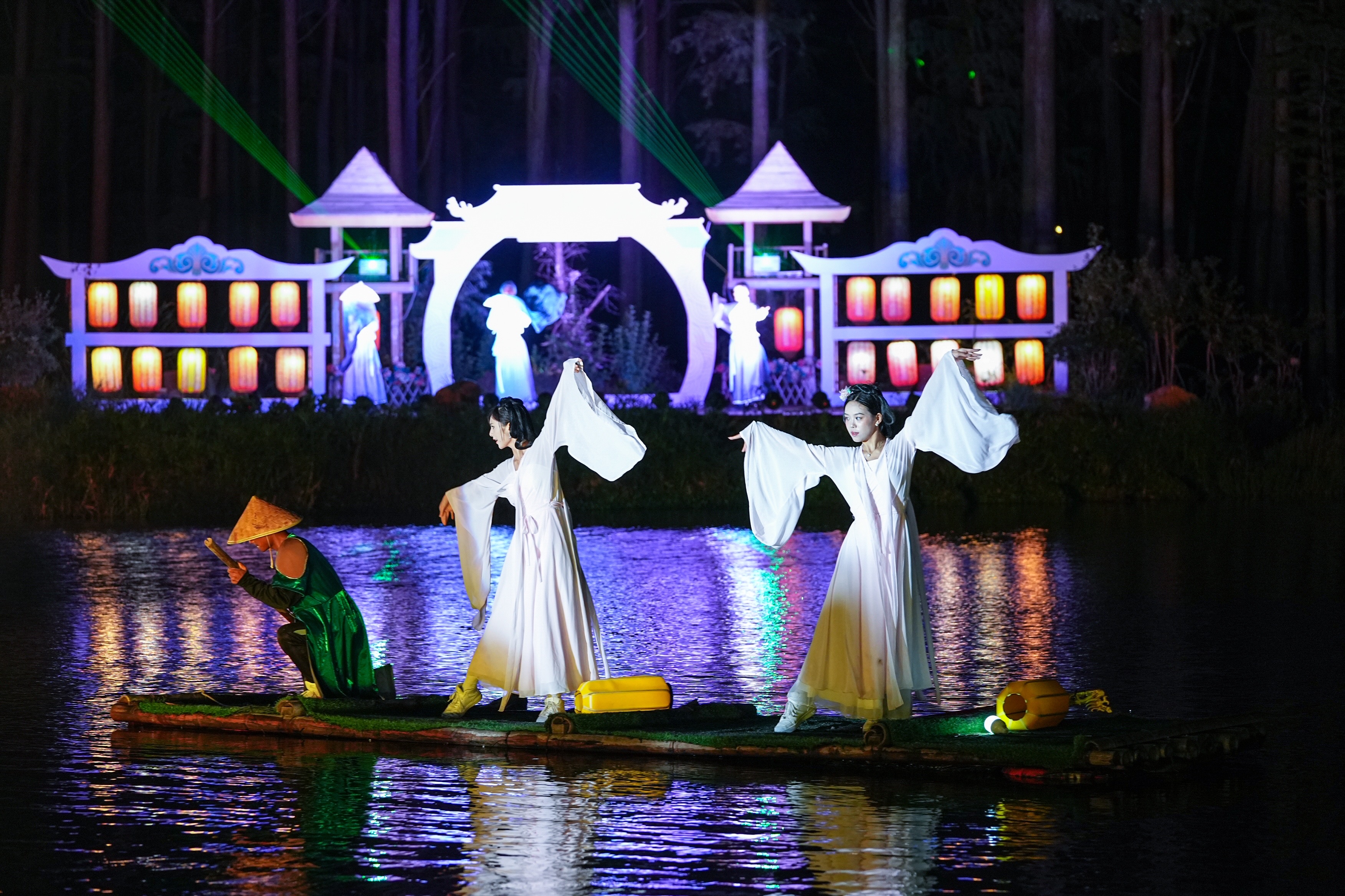 除了邀月为伴,中秋限定的国风演艺也在园内重磅开秀。融合古今艺术文化精粹的“中秋奇妙夜”舞台上,一展惊鸿的华服舞蹈秀,演绎出经典的中式美学;梦幻的魔术表演,以出其不意的视觉反转效果惊艳众人。此外,取材于玉兔和月亮的国风齐舞,独具特色的佤族街舞和潮流的动感热舞,也轮番为观众带来了精彩绝伦的视听大秀。除了精妙的舞台表演之外,杉林秘境中的《曲水流觞》表演,将古代文人墨客诗酒唱酬的雅事呈现在游客眼前,伴随着璀璨灯火,文人们在竹筏上吟诗作对,歌舞相携,与游客们一同欢庆佳节,演绎着流传千年的中式浪漫。