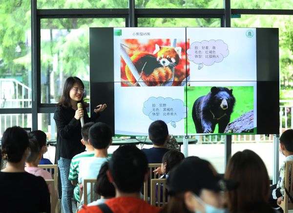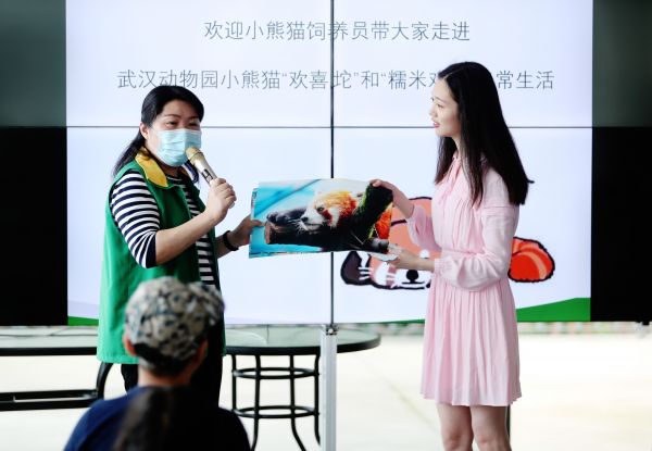 “小熊猫双胞胎性格迥异,‘糯米鸡’活泼大胆,‘欢喜坨’害羞腼腆,但是它们都非常亲近每天精心照顾它们的饲养员,打扫笼舍时它们都爱黏着人。”王高峰满脸笑意地举起三张照片,为孩子们展示小熊猫在武汉动物园的日常生活。她给孩子们科普小熊猫的饮食,“除了竹叶,小熊猫还爱吃苹果和米糊。”