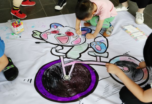 30个孩子围在画布前,结合小熊猫毛色分布特征,发挥绘画创意。年龄较大的孩子们是写实派,他们细心涂上小熊猫尾巴上的红褐色环纹,也格外留意小熊猫脸上的白色毛发,创作了三幅栩栩如生的小熊猫画像;年幼的小朋友发挥天马行空的想象力,共同创作出彩色的“欢喜坨”和“糯米鸡”,两幅彩虹般的卡通画传递着童心对小熊猫满满的喜爱。