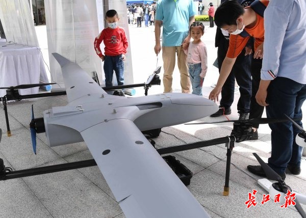 在湖北省测绘工程院展区,工程师向“小科迷”介绍测绘用的固定翼无人机。长江日报记者高勇 摄