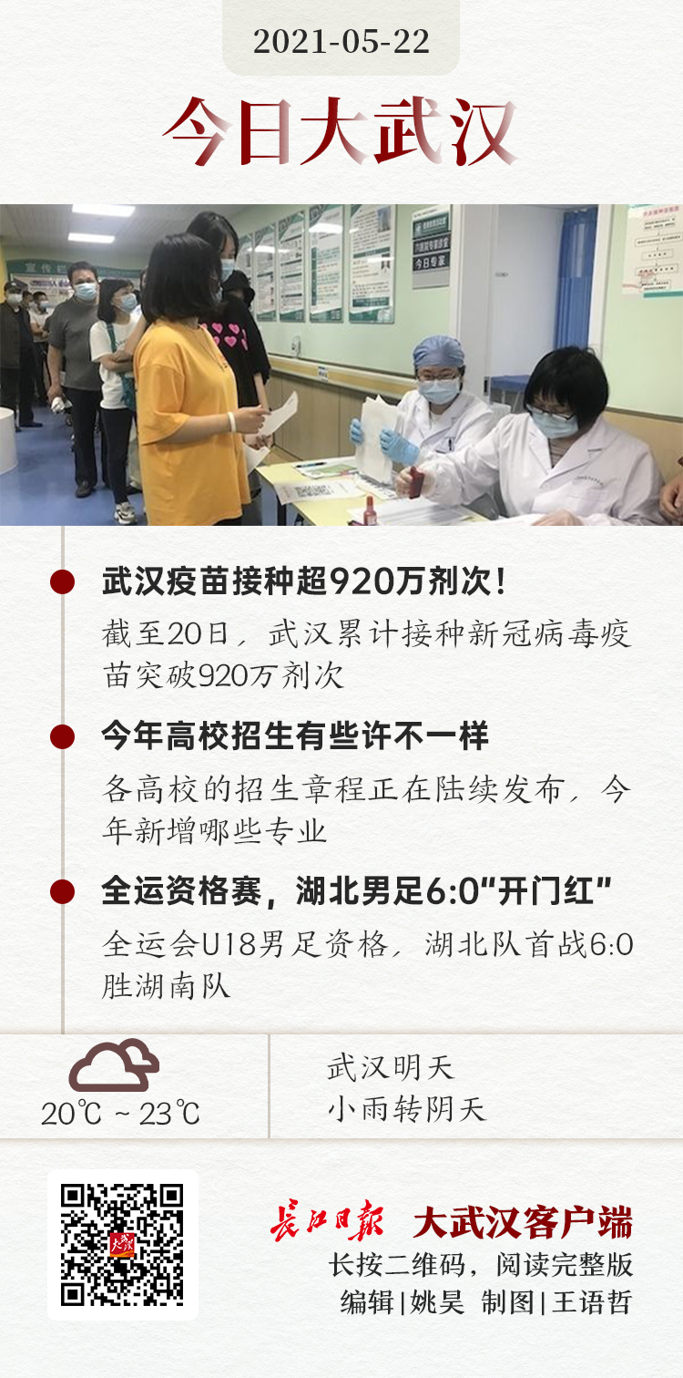 记者从武汉市卫健委获悉,截至5月20日,武汉市累计报告接种新冠病毒疫苗突破920万剂次。详见>>