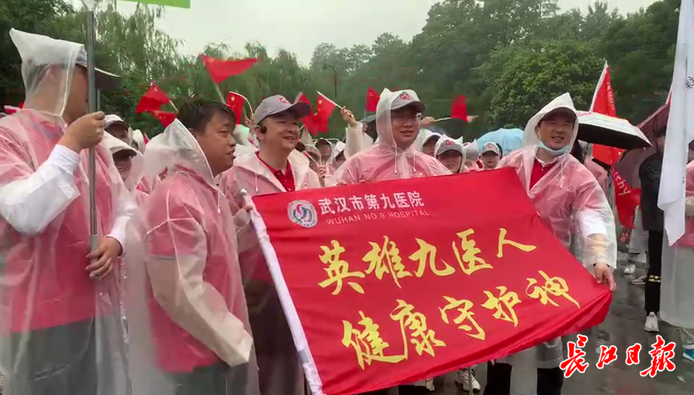 武汉市第九医院方阵队员们拉着写有“英雄九医人,健康守护神”的旗帜,大声喊出:“九医九医,威武第一。”