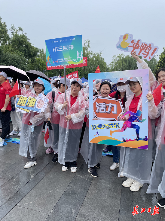除此之外,现场其它“大武汉”元素也受到了参与者热捧,武汉市第三医院方阵的队员们举起“我爱大武汉”手牌与之合影。