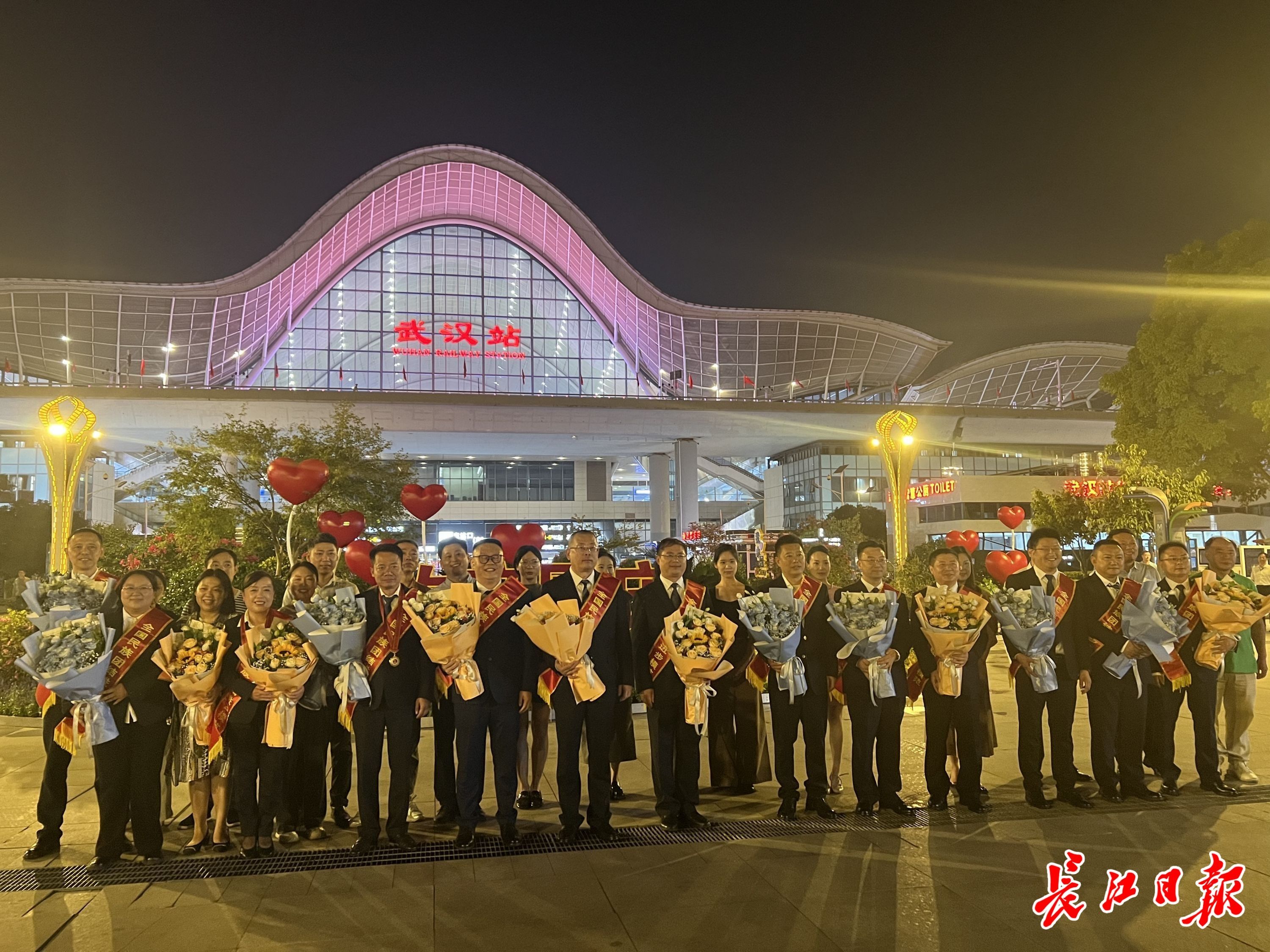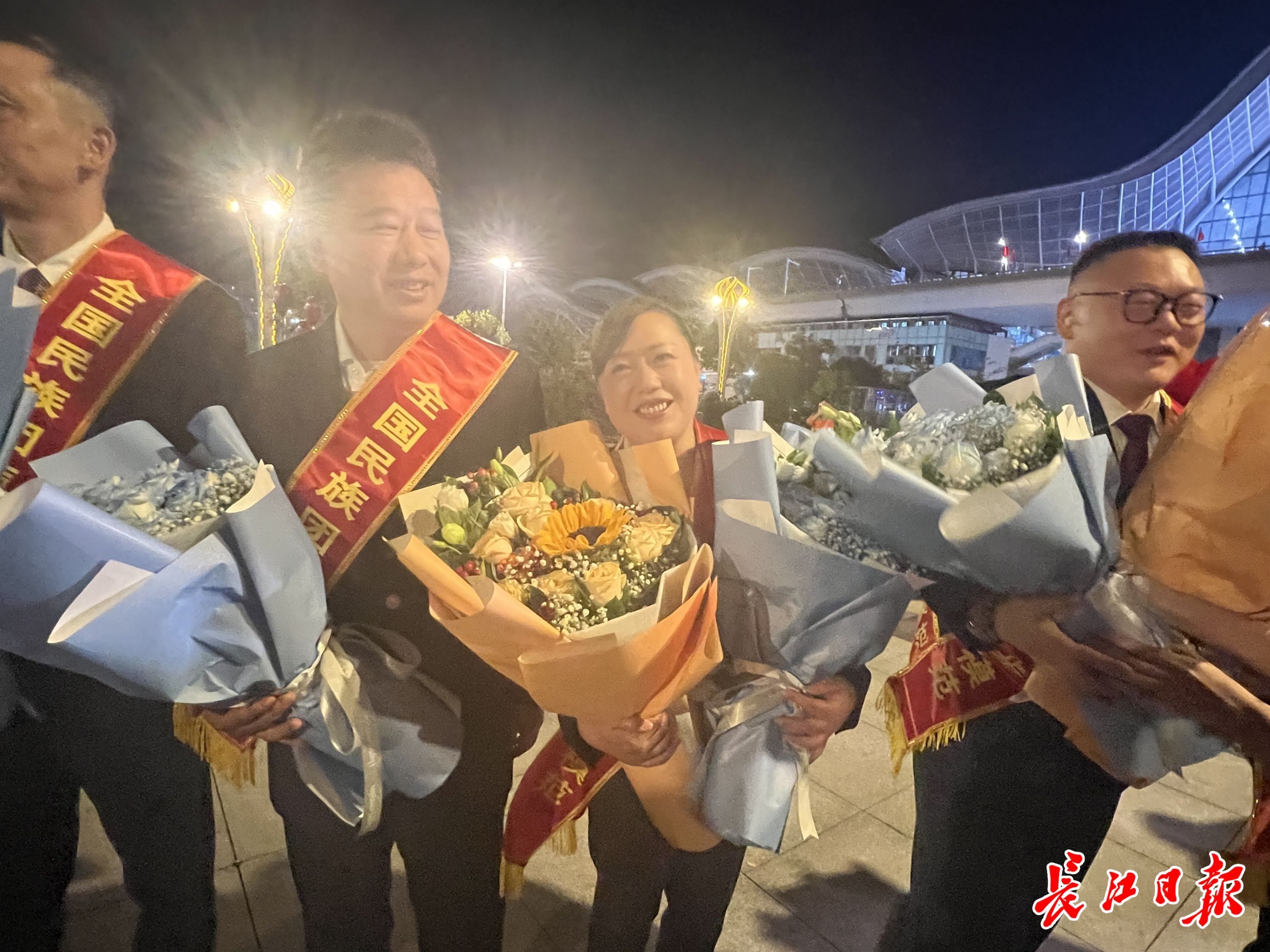 27日晚9时左右,当天上午刚参加过全国民族团结进步表彰大会的湖北省代表从武汉火车站东出站口健步走出,每个人都笑容满面。对面,十余名往届全国全省民族团结进步模范和各族群众代表手拿鲜花,热情欢迎“新模范”。