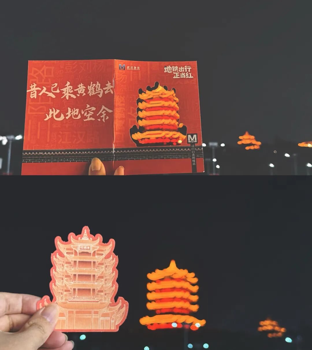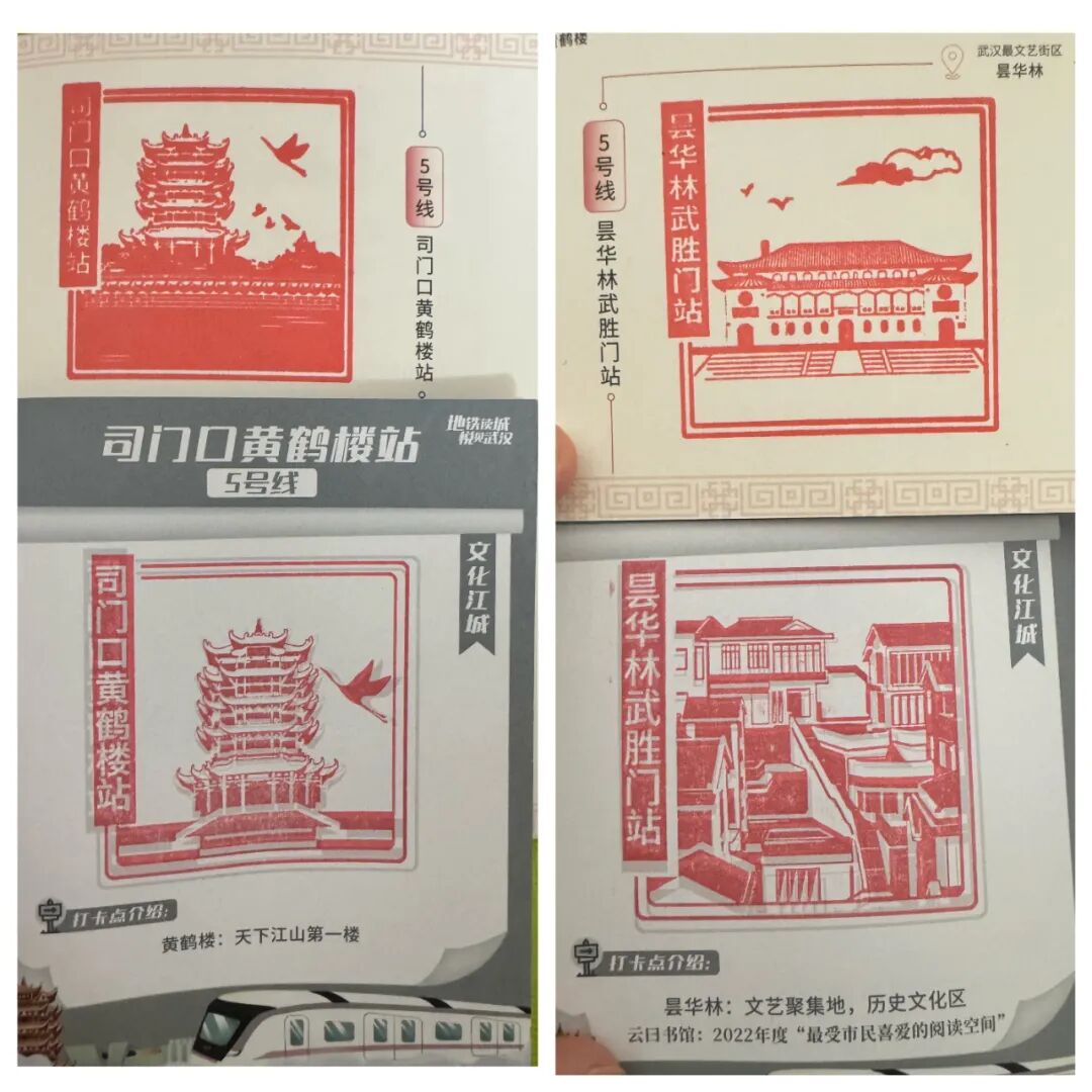 下班后,我迫不及待地按照活动指引,直奔5号线徐家棚地铁站领取了新款集章册。拿到册子后,不禁感慨:真有国庆气氛!除此之外,我还惊喜发现此次集章本暗藏玄机:封面的黄鹤楼有虚线可以撕下来,撕下后就是一个黄鹤楼形状的“打卡窗”,册子内还有拍照出片攻略。我想着,这不就正好适配最近网上很火的“黄鹤楼纸条拍照机位”吗?