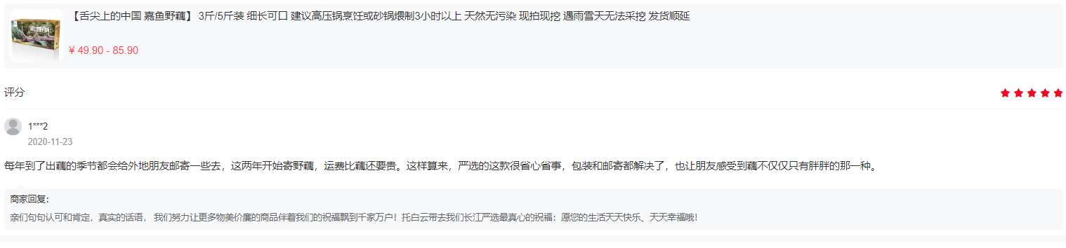 长粉“果果”欣喜地说,自己是地地道道的湖北人,每年出藕的季节,都想给外地朋友邮寄一些“湖北味道”。这两年开始寄野藕,但运费比藕还贵,偶然间在长江严选看到了嘉鱼野藕,性价比很高,包装和邮寄都解决了,包装也不错,送给朋友很合适。