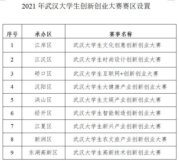 今年创赛的主题是“就在武汉,创赢未来”。九大赛区“赛区赛”围绕服务我市“965”产业集群发展,在江岸区、江汉区、硚口区、汉阳区、洪山区、经开区、江夏区、新洲区和东湖高新区等9个区(开发区),分别设立文化创意、时尚设计、互联网+、大健康产业、文娱产业、智能制造、新兴产业、农文旅产业和高新技术赛区。
