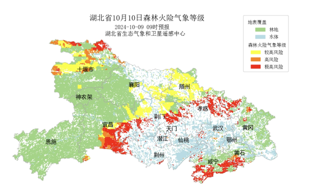 受持续高温少雨影响,我省森林内部生物质干燥,提高了火灾的发生概率。预计未来3天,鄂东北中部和西南部、鄂东南南部、江汉平原东北部、鄂西北北部森林火险气象等级较高,其中十堰局部、黄冈局部、随州局部、孝感局部、咸宁南部、黄石局部森林火险气象等级为极高风险。12日后,受局部地区降水过程影响,我省较高火险等级范围逐渐减小。