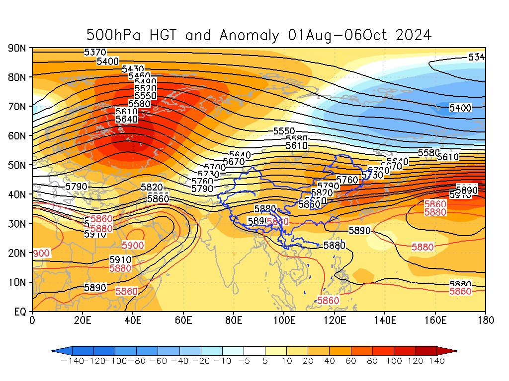 2024年8月1日至10月6日500hPa高度场及距平场显示,8月以来副热带高压势力异常偏强。
