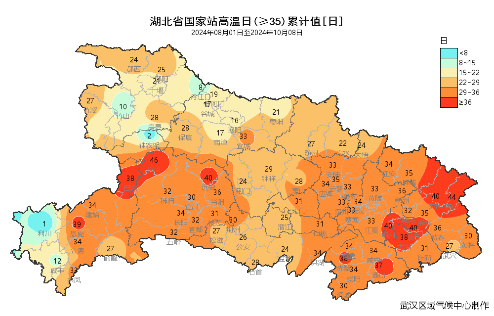 8月以来湖北省平均气温27.4℃,较历史同期偏高2.8℃,排历史同期第1位,日最高气温≥35℃累计日数29.5天,与2022年同期持平,并列历史第1位。