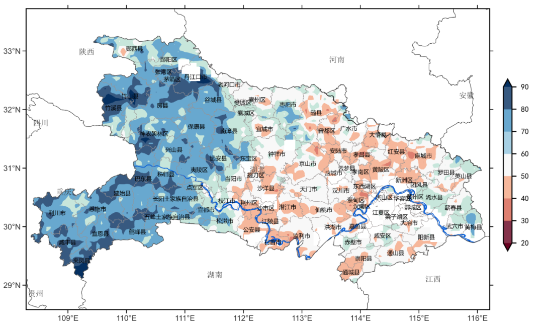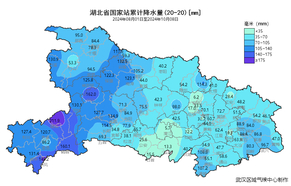 8月以来湖北省平均降水量76.7毫米,较常年同期偏少近七成,排历史同期倒数第1位,其中鄂州、应城、石首、监利、潜江、安陆等地偏少9成以上,随州8月30日至9月29日连续31天无降水。