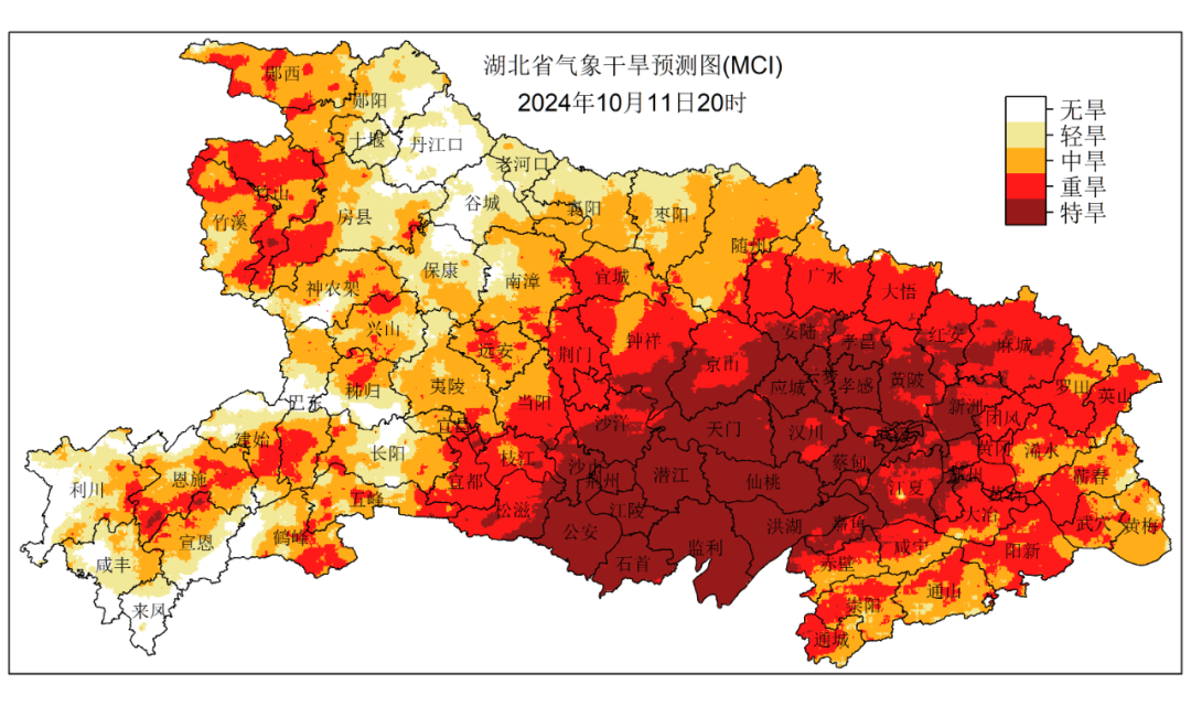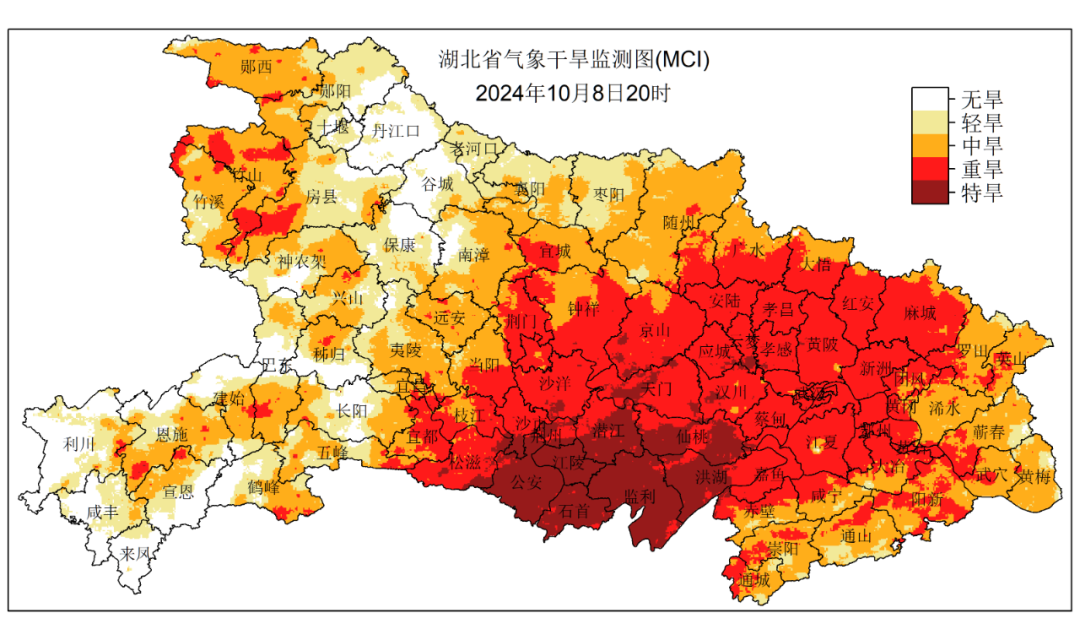 受出梅以来持续晴热高温天气影响,8月中旬开始我省旱象露头,至9月29日全省除咸宁、黄冈中南部外大部出现轻度以上等级气象干旱;9月29日至30日受天气系统和人工增雨作业影响,西部旱情得到缓解,但中东部仍有较重旱情,其中江汉平原南部荆州、潜江、仙桃等地特旱。