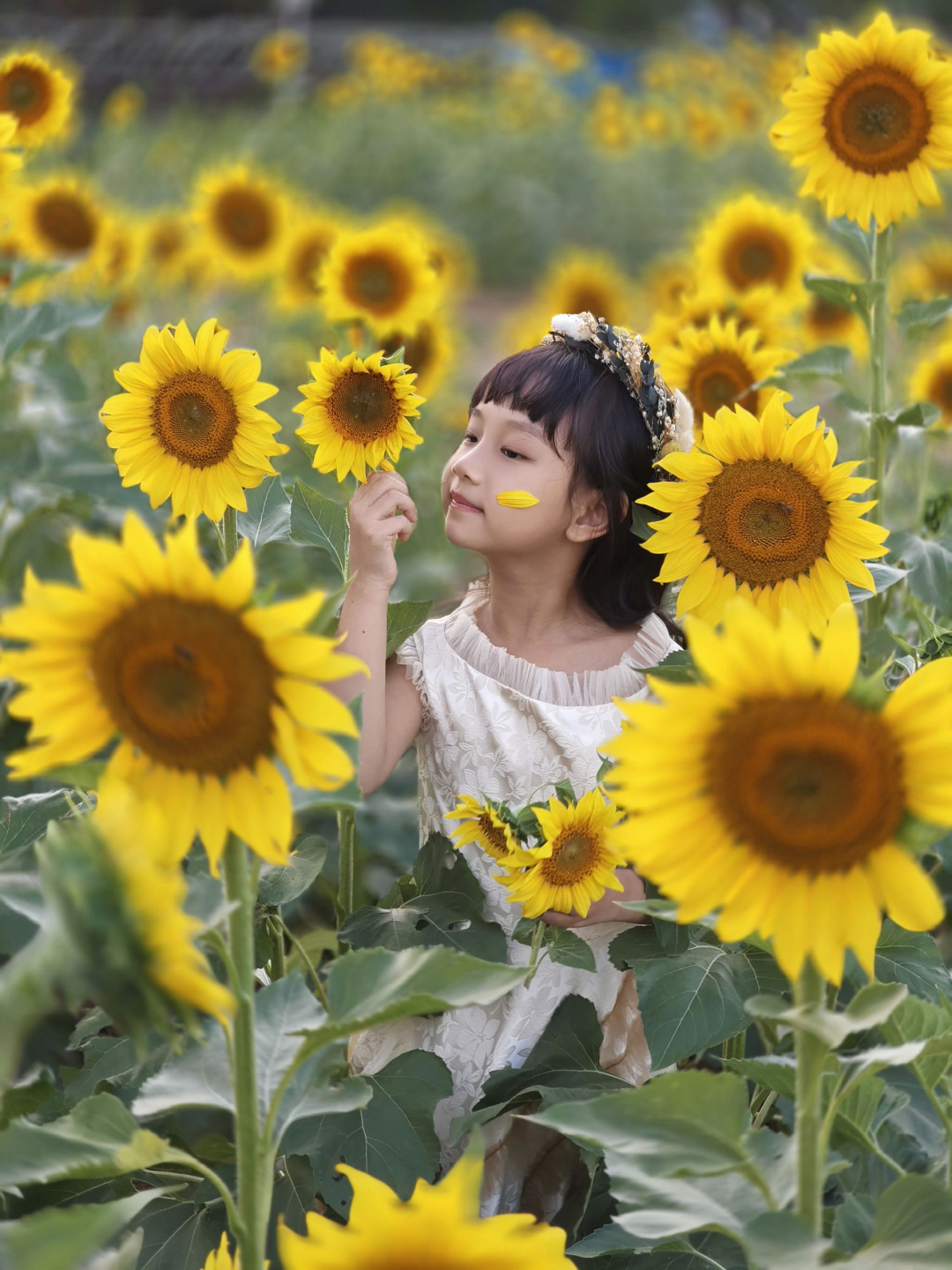 葵花香浓,小女孩置身于盛放的向日葵田。摄于马鞍山森林公园。