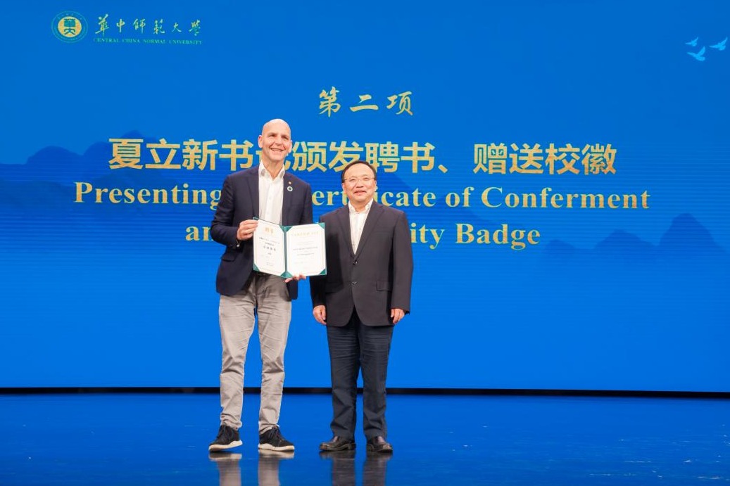 聘任仪式上,夏立新向本杰明•李斯特教授颁发了名誉教授聘书,并为他佩戴校徽。华中师范大学党委书记夏立新表示,本杰明•李斯特受聘为名誉教授,是学校坚持人才引领驱动、加强国际科技创新合作的又一重要里程碑。作为不对称有机催化领域的开创者之一,本杰明•李斯特开启了催化研究的新篇章,也是光催化自由基研究领域的引领者。期盼他以宽广的前沿视野、深厚的学术积淀,带领团队不断加强学校与海内外大学、国际组织间的交流,深化学校在人才培养、学科建设、科学研究、社会服务和光化学领域产业化发展等方面的国际合作,推动形成拔尖创新人才国际联合培养机制,共同应对全球性挑战,为全球科技创新治理、为人类绿色低碳美好未来做出新的更大贡献。