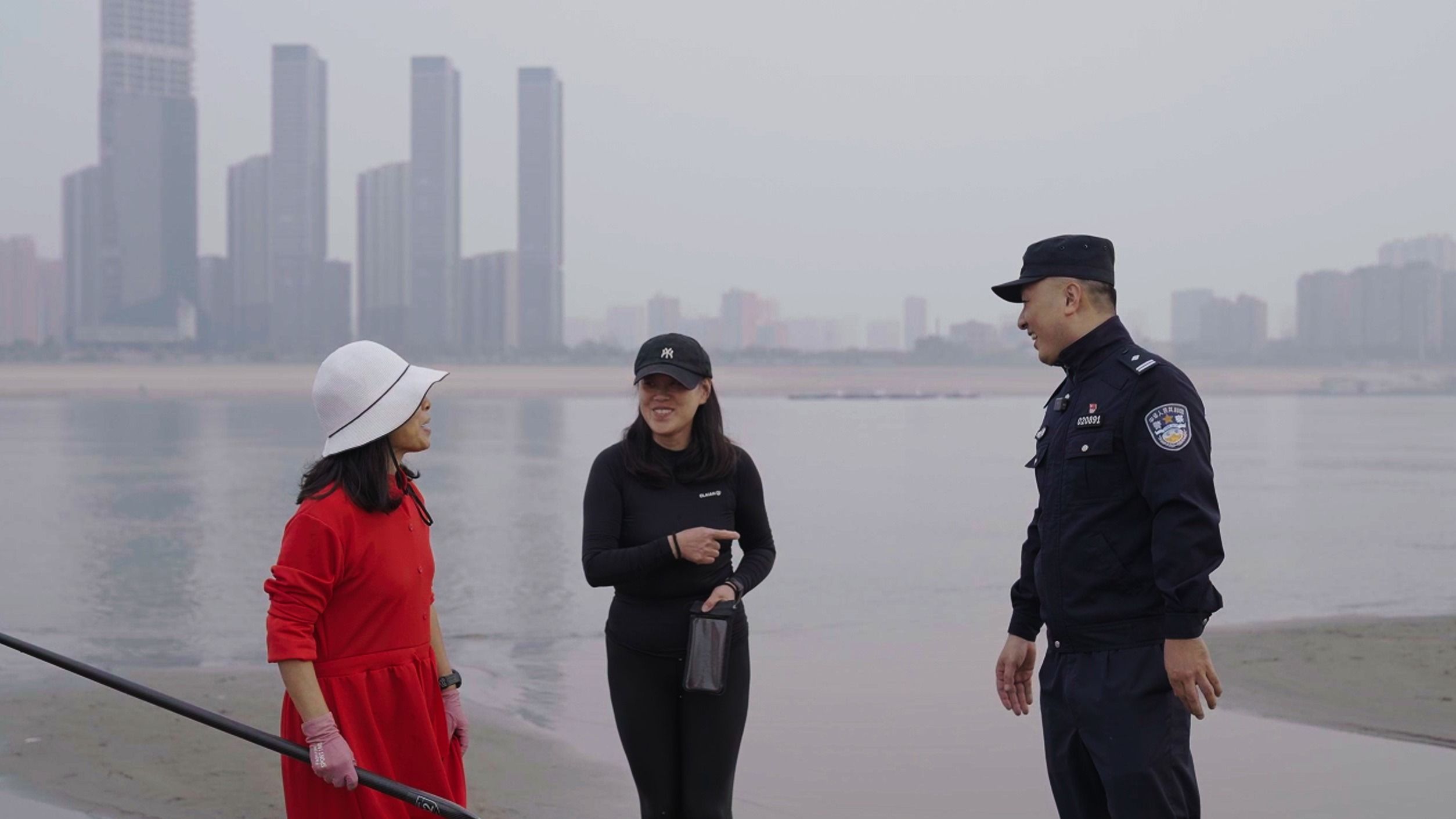 “请注意安全!不要在丁字坝上游玩,天要暗了,赶快上岸。”在巡逻过程中,民警李丕森不断提醒游泳和桨板爱好者注意安全,特别是在天色渐暗和气温与水温温差较大的情况下,更容易发生危险。“温差大,容易抽筋,有的游泳爱好者第一次游过来,没力气了,游不回去了就报警让我们来救援。”此外,丁字坝上的大型石块粗粝,不穿鞋很容易被划伤流血,因此民警在巡逻时除了携带救生圈、抛绳包等救生装备外,还会随身携带创可贴等急救用品。