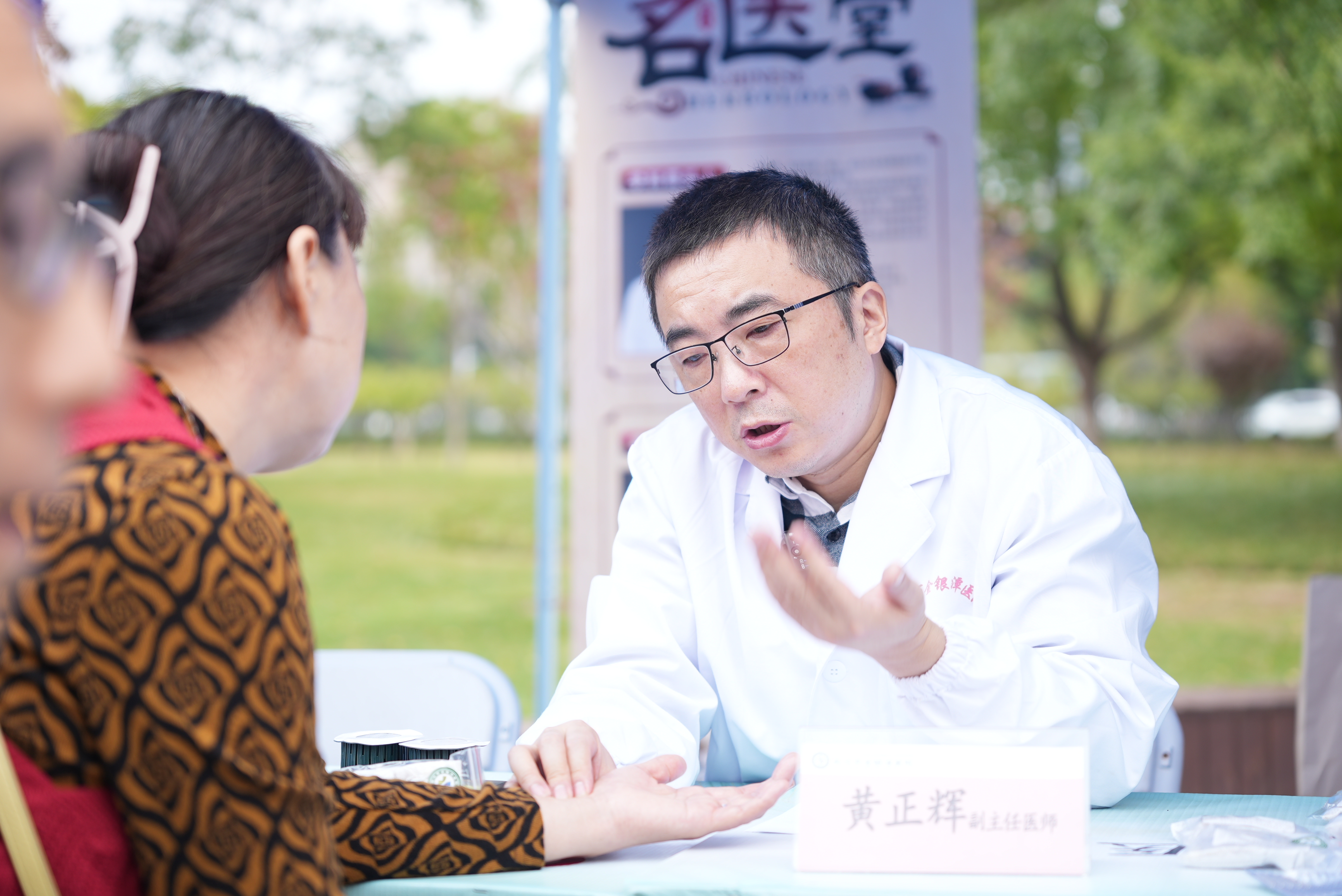 武汉市金银潭医院中医科主任黄正辉现场为居民把脉问诊。