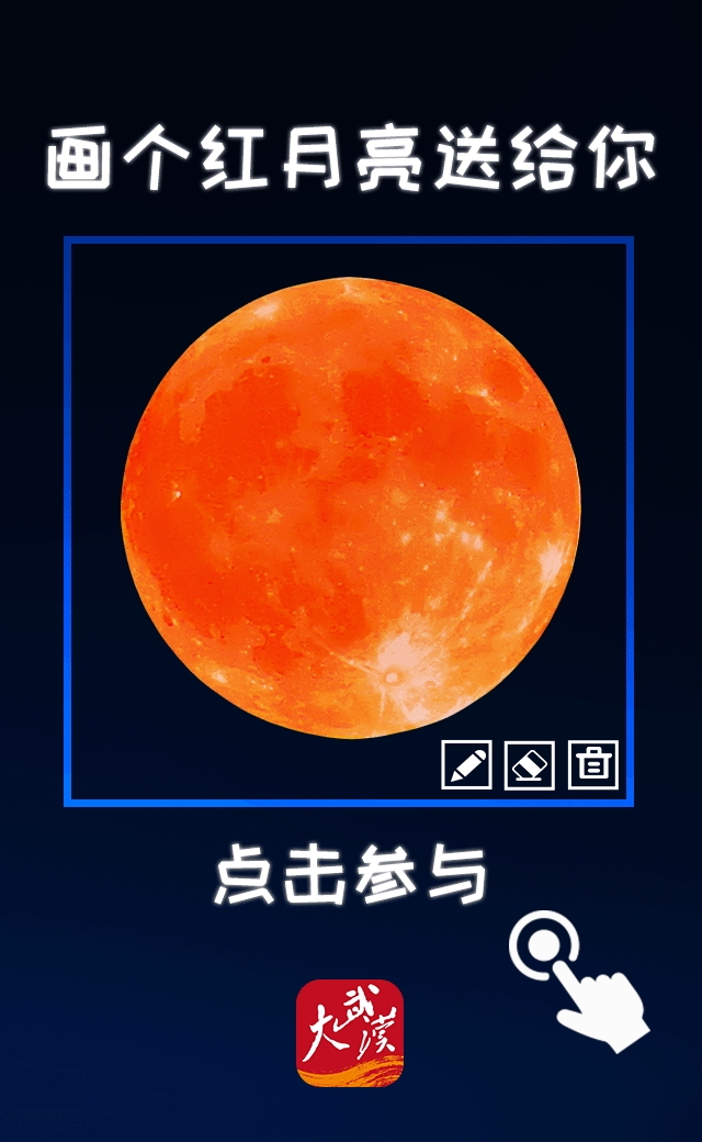 26日晚,“超级月亮”与月全食浪漫邂逅。长江日报大武汉客户端开启“拍一拍”互动活动,邀请网友晒出超级红月亮,可选择“拍一拍”或“画一画”参加。截至26日晚10时,近30万网友关注,佳作频出。详见>>>