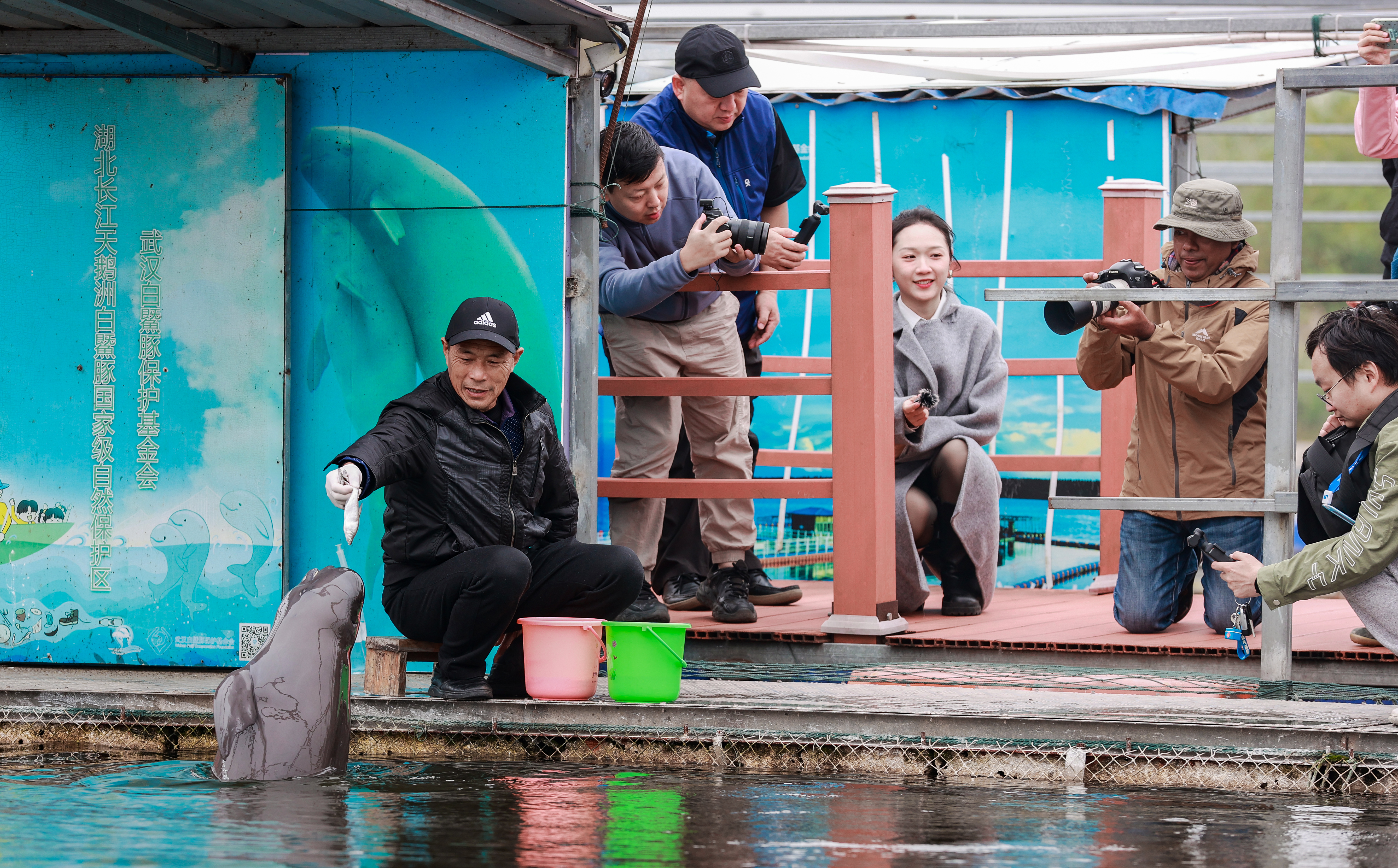 参观湖北石首长江天鹅洲白鱀豚国家级自然保护区的网箱繁殖江豚。陈亮 摄