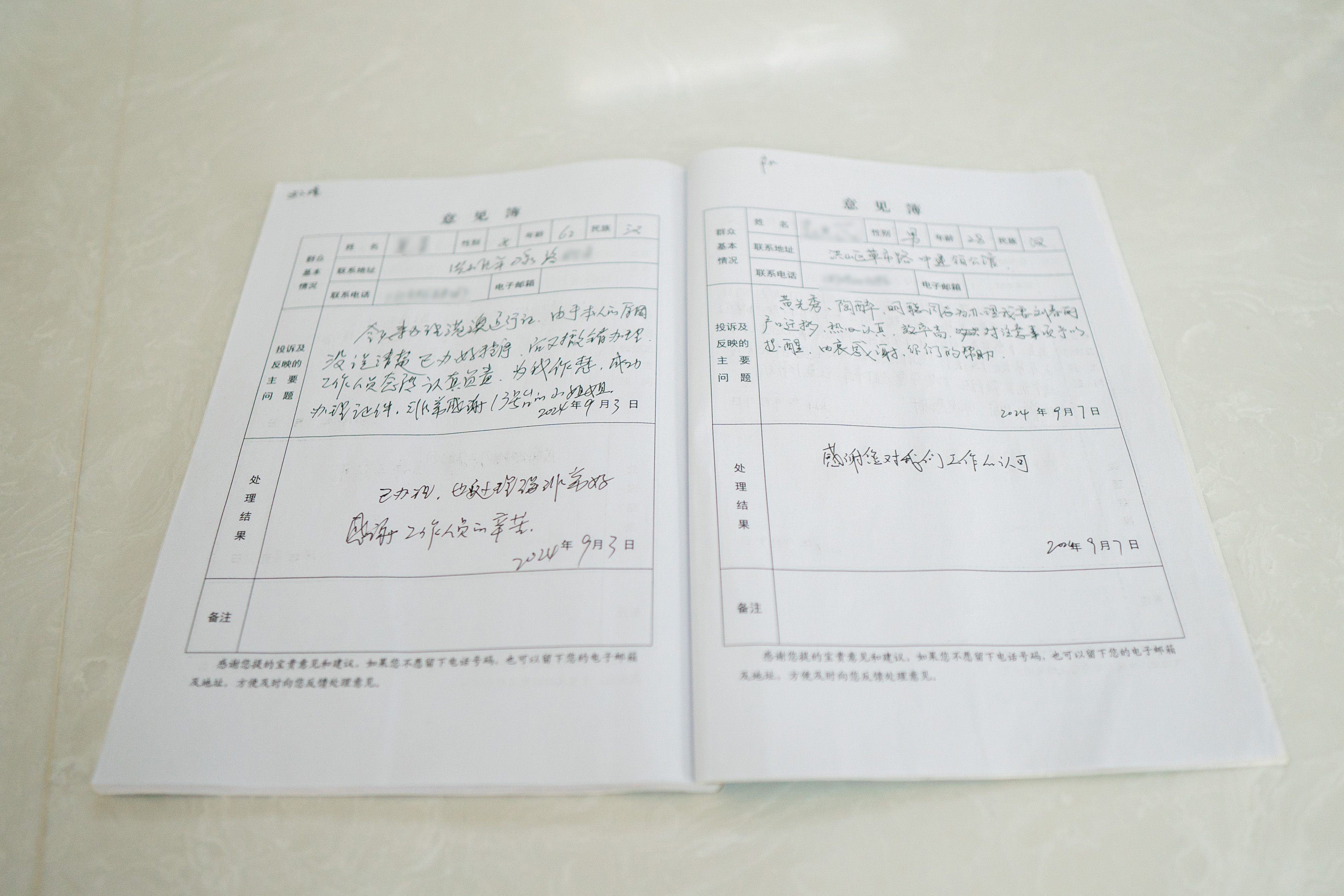在武汉市洪山区政务服务中心的四楼,一本厚厚的“2024年意见簿”静静地陈列于公安窗口一侧,每一页都密密麻麻地记录着市民的心声与反馈,字里行间洋溢着群众对窗口民警辅警真挚的感激与赞誉。这本意见簿已成了名副其实的表扬册。