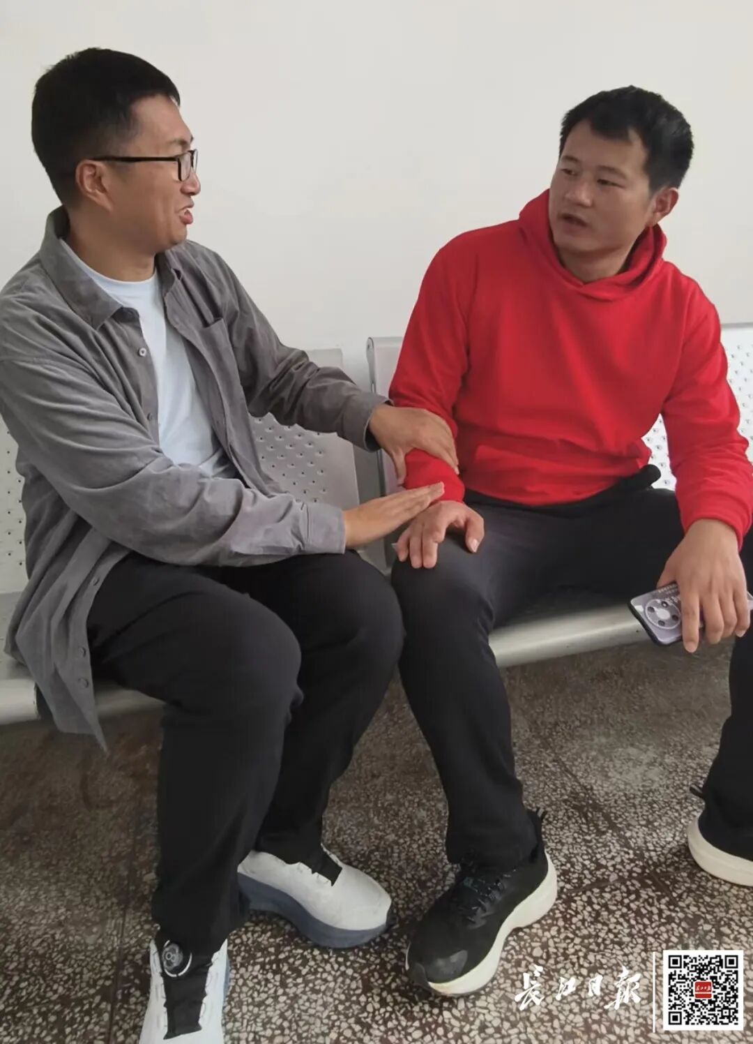 王笑和冯鹏在聊天。记者赵子瀹 摄