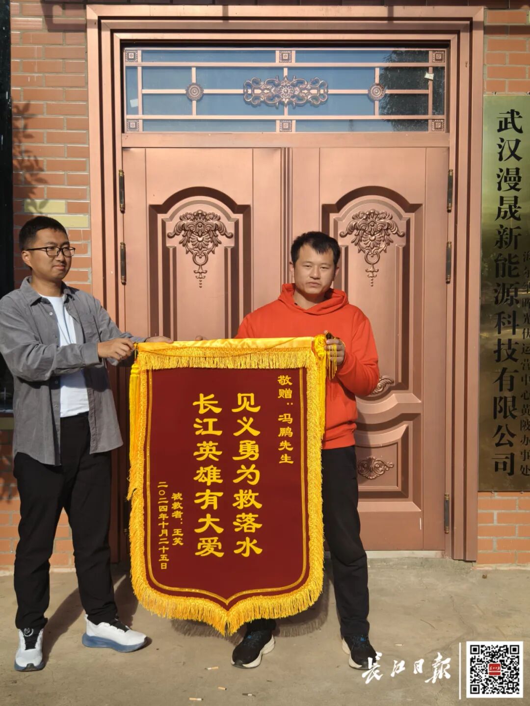 王笑拿出一面锦旗递到冯鹏手中后,对冯鹏说:“你是我的救命恩人,真心感谢你下水救我;你与另外两位下水救我的哥哥,都是英雄。”