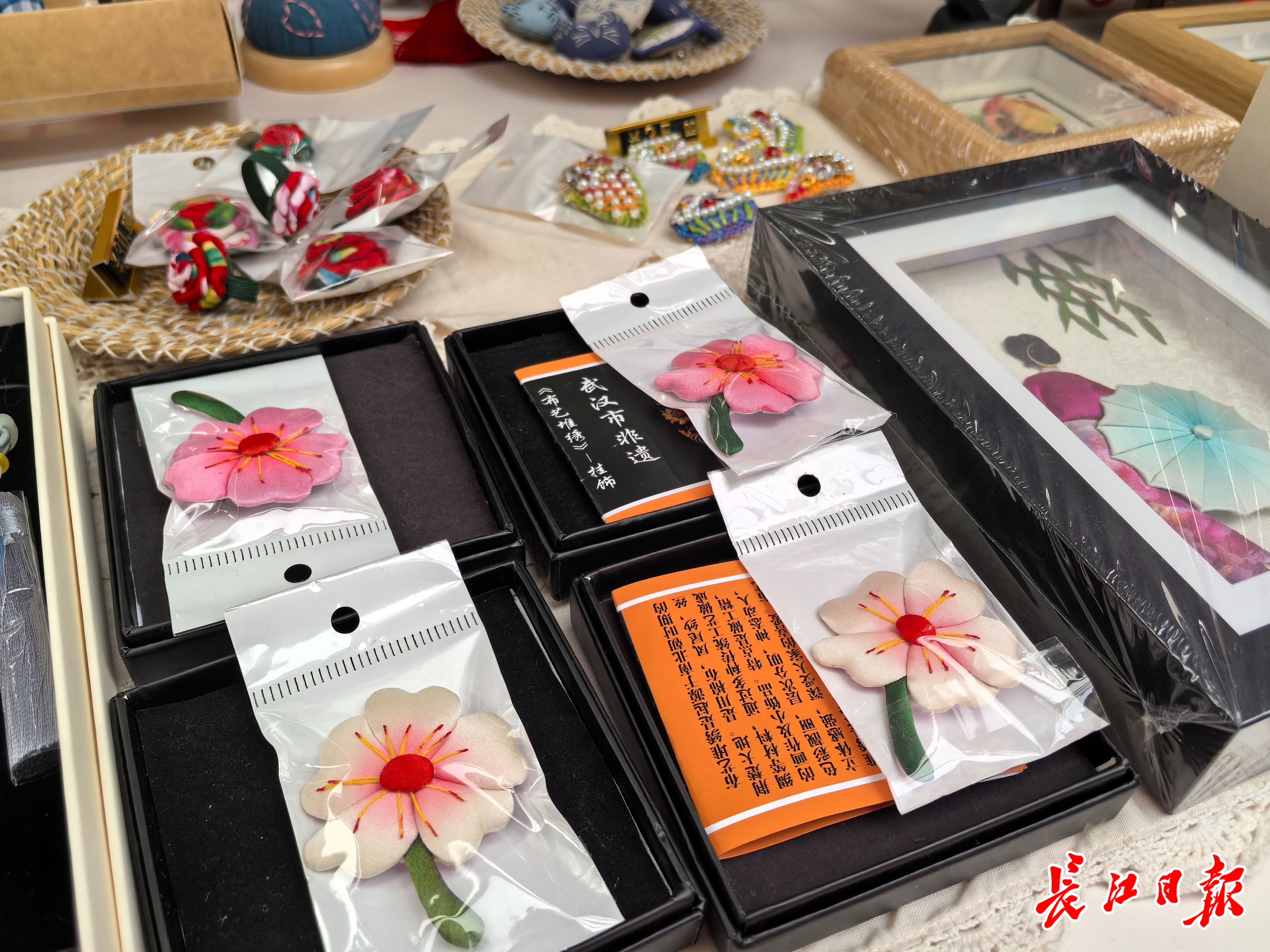 非遗技艺布艺堆绣制作而成的樱花胸针。长江日报记者 晋晓慧 摄