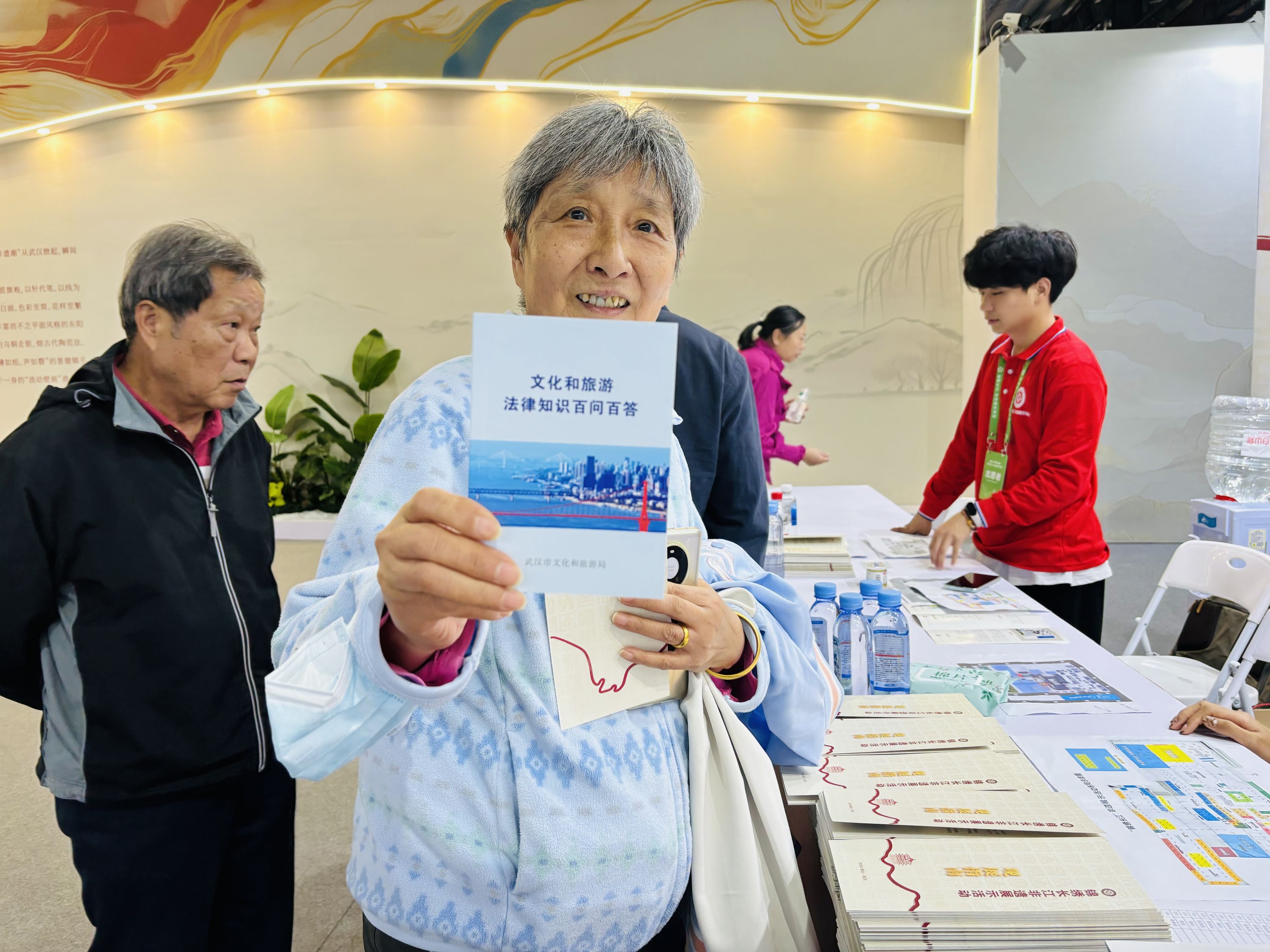 活动现场,工作人员向市民发放《武汉市非物质文化遗产保护条例》《文化和旅游法律知识百问百答》等普法宣传手册。一位市民接过《武汉市非物质文化遗产保护条例》看了起来,还和文旅普法轻骑兵展开交流。