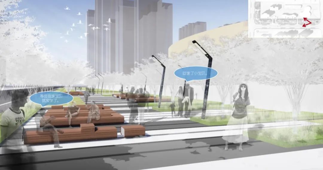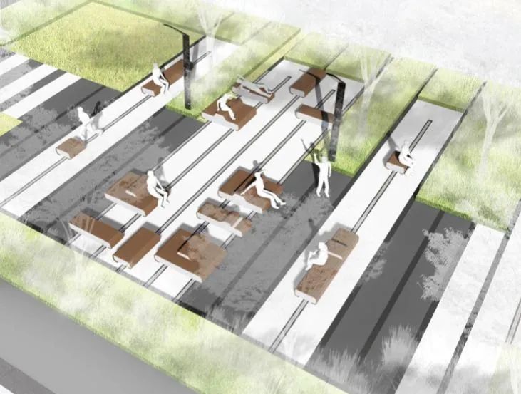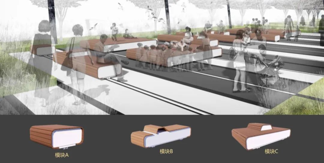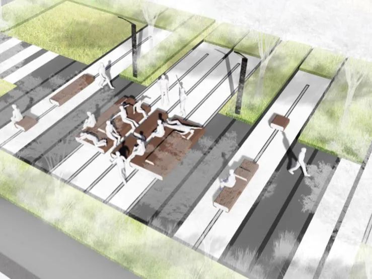 根据效果图可以看到公园核心区内设计了多条滑轨,每组滑轨上都安装有3至5个可移动座椅,座椅可前后移动、随意组合,下方还巧妙地设有一个“小刹车”,这些座椅如同“椅子版”积木通过排列组合就能“拼装出不一样的快乐”。