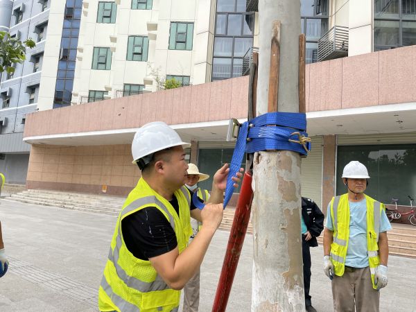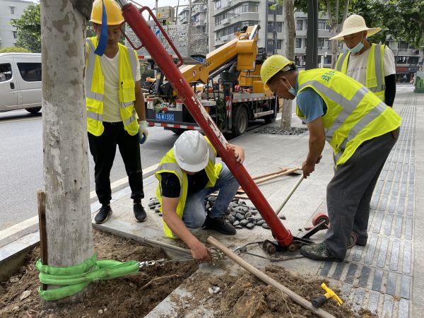 记者看到,3名园林工人先将树穴覆盖的鹅卵石取出,再将树穴土壤刨松。接着,在树干中部和下部绑上木条和轮胎皮以保护树身,再将液压千斤顶与树身相连,并将连接点固定。之后,工人们操作千斤顶,将压力传导至树身,使树身朝倾斜的反方向移动,工人们随之将杉木楔打入树穴土壤内,对树根的土球进行支撑。最后他们回填土壤,将缝隙填满。一棵歪树被扶正只花了约30分钟。