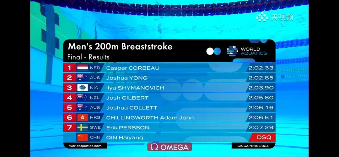 不过,直播镜头显示,就在覃海洋走出泳池后,裁判上前和他交流,随后在官方公布的成绩单中,覃海洋的名字后面显示了DSQ,意为取消比赛资格。原本获得亚军的荷兰选手科尔博最终夺冠。