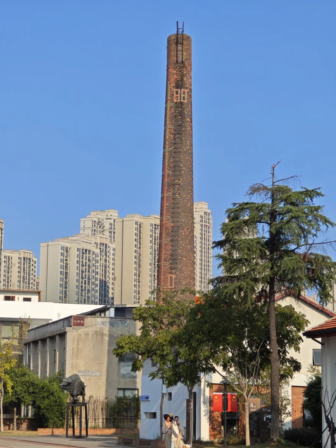 我们现场查阅资料得知,原来,这个巧妙的设计是在保留原历史建筑的基础上,以公共艺术的手法和城市更新的理念,通过设计改造,让烟囱成为一个巨型“温度计”,当前温度是多少它就显示多少,每个小时变化一次。有朋友评价:“改造得很有创意,这个设计与老建筑融为一体!”我站在烟囱下感受着,此时风吹过来,仿佛过去的声音在耳边回响。