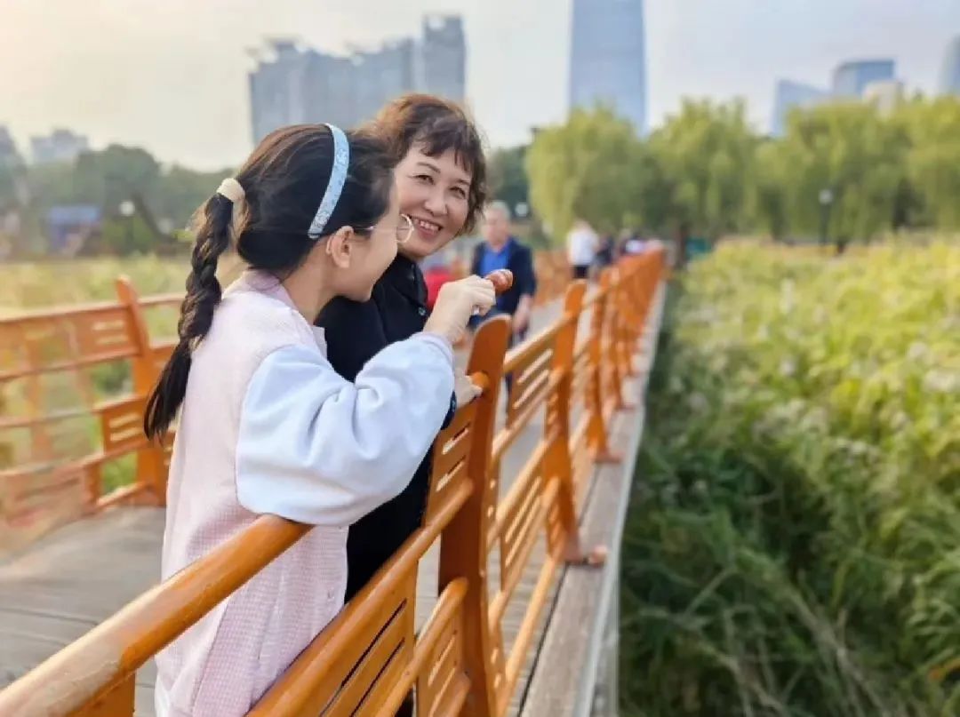 祖孙俩在汉口江滩赏秋,笑容满满。