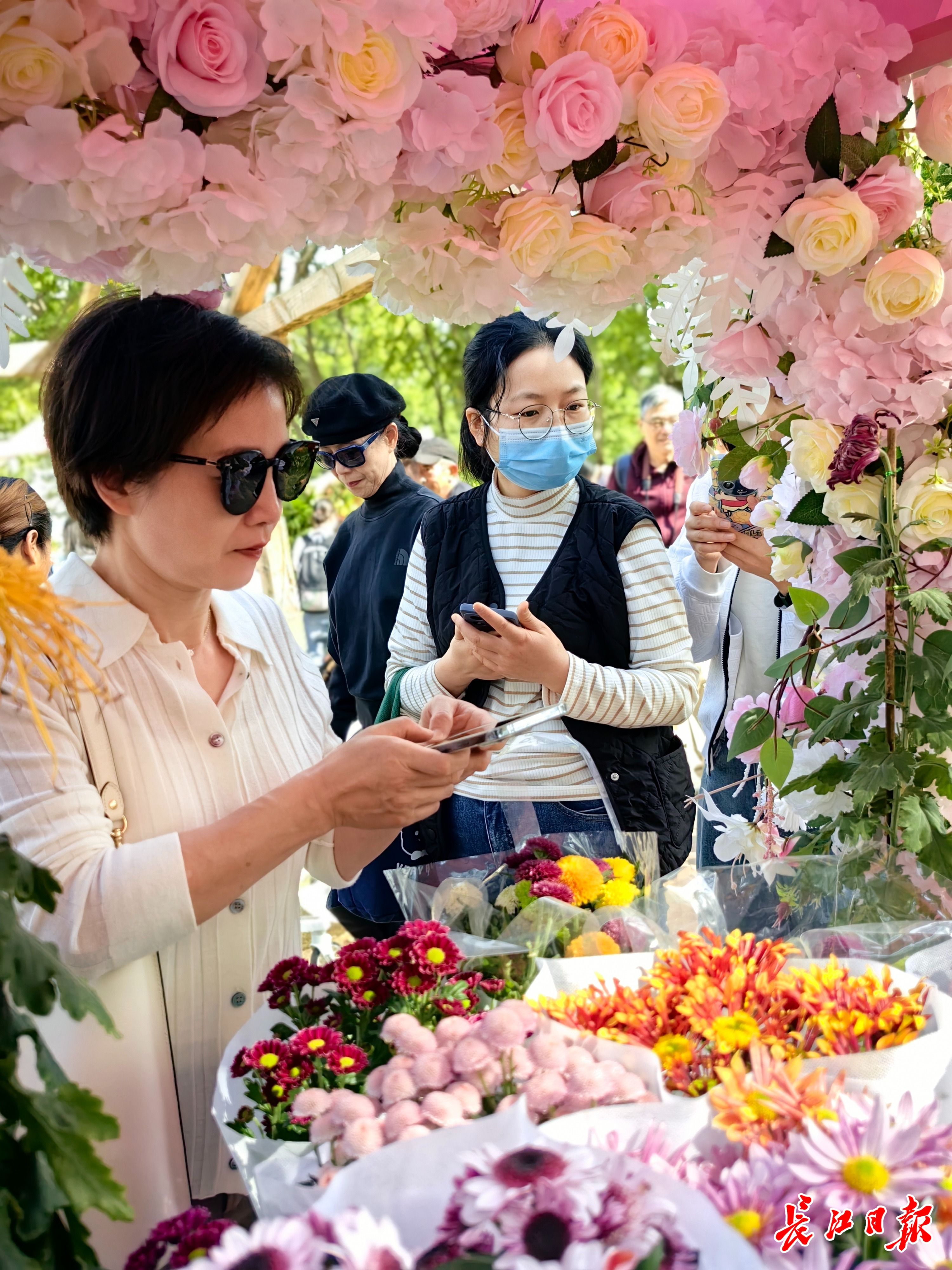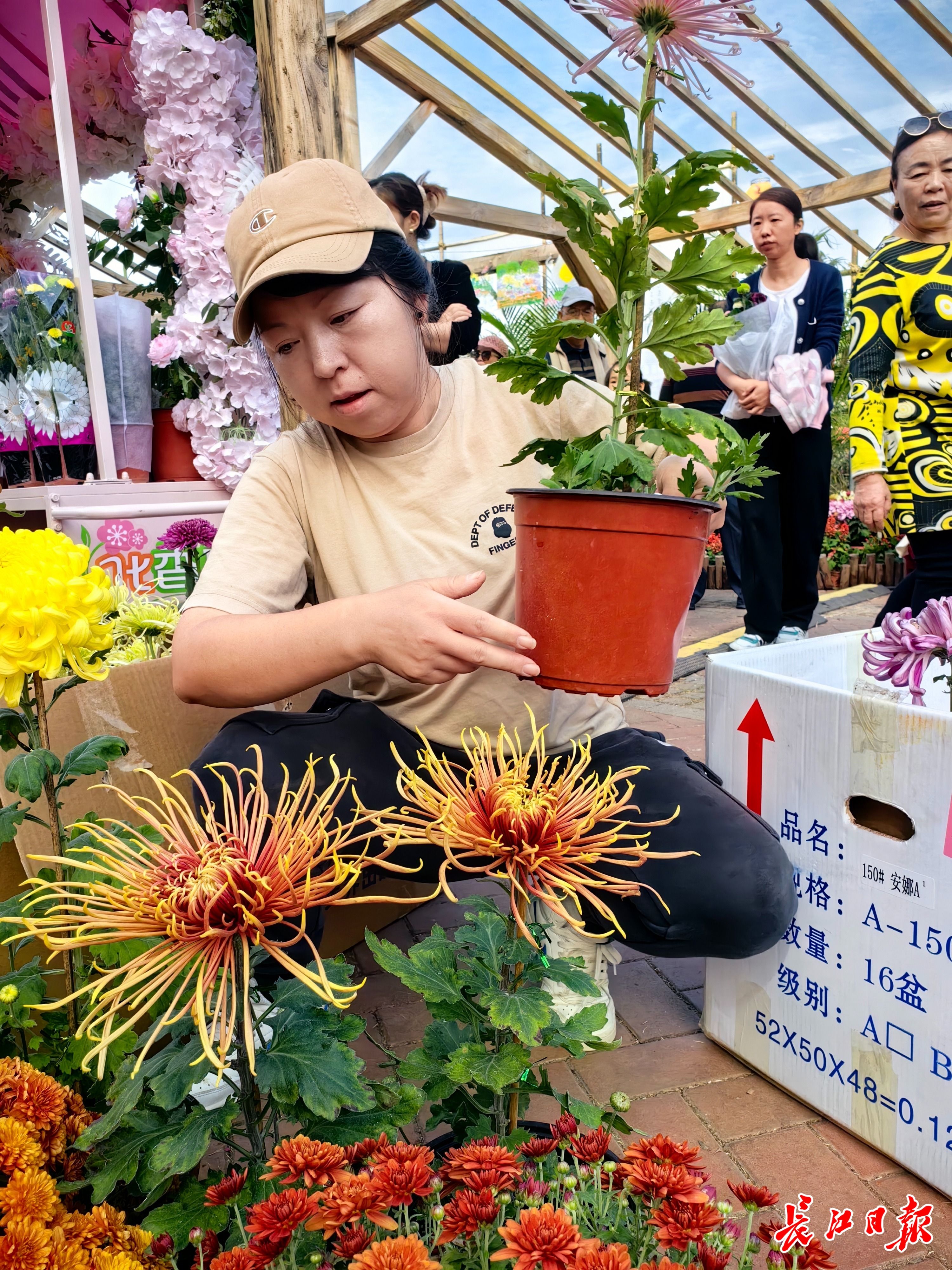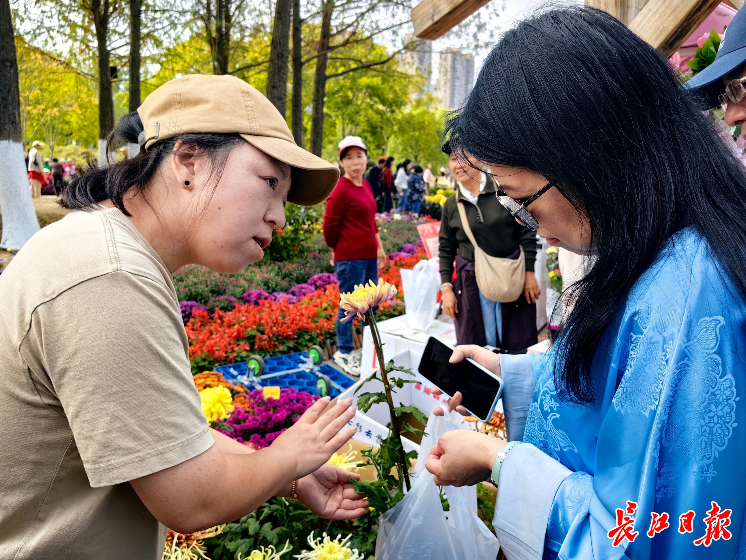 正在“当垆”卖花的,是“中国菊艺大师”李建祥的女儿、武汉“盘龙”系列菊花传承人李江。看到美丽的菊花,不时有市民在展位前停住脚步,仔细欣赏,询问价格,李江逐一热情地回答。