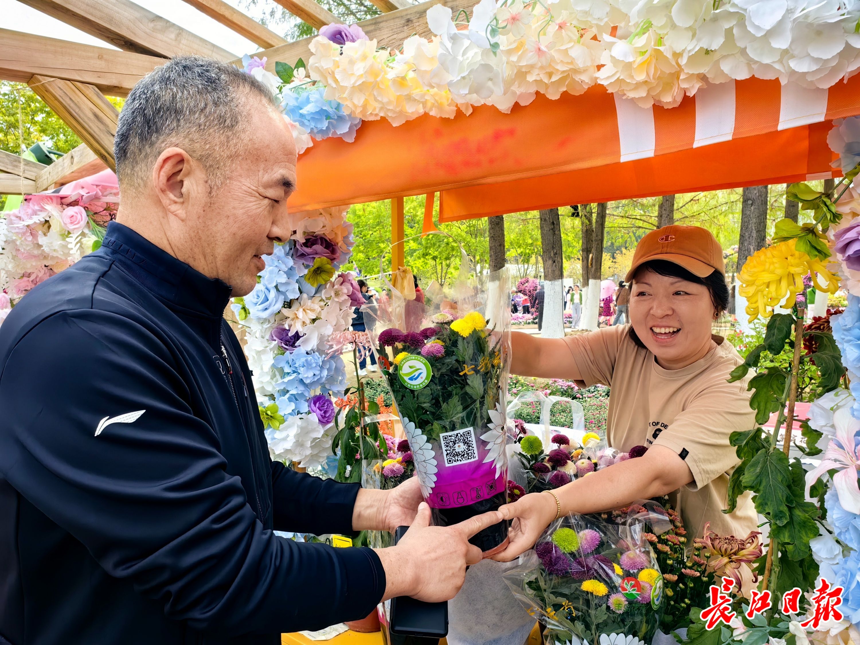 李江(右一)在武汉金秋菊展现场售卖菊花。 记者明眺生 摄
