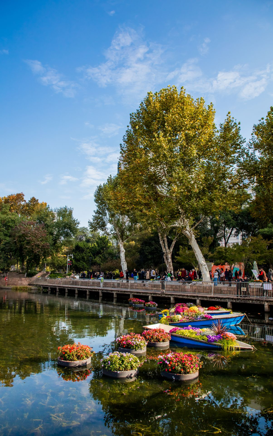 湖中繁花烂漫,湖边观众开心享受美好赏花时光,摄于中山公园。