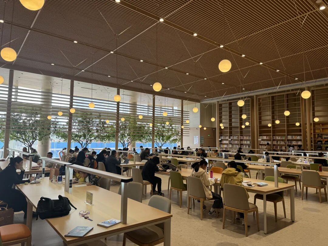 除了常规的书桌加椅子配置,还有一个小设计让我很惊喜——休息区的设计太赞了!落地玻璃窗边,一排排“小树”茁壮生长,仔细一看,才发现旁边的“土壤”就是一个个拼接的沙发,可供休息。旁边还有一个个粉色“爱心”,走近一看是让人舒服的躺椅,这种设计真是既有趣又贴心。配合整个阅读区的木质装修风格、悬挂的球形暖光灯,让人在阅读的时候感觉特别温馨。