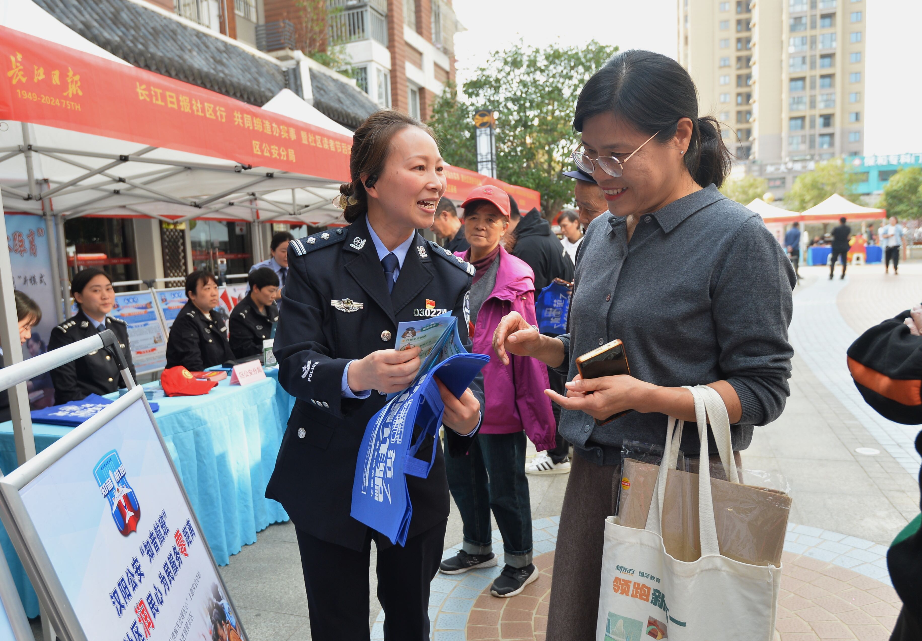 “您先登记,留下手机号,然后拍证件照、录入指纹,扫码缴纳换证20元即可。后期,江欣苑社区民警蔡国胜将为您提供送证上门的服务。”汉阳公安“知音航班”民警柯茜和江堤派出所辅警荆玲玲耐心给居民解答办理流程。