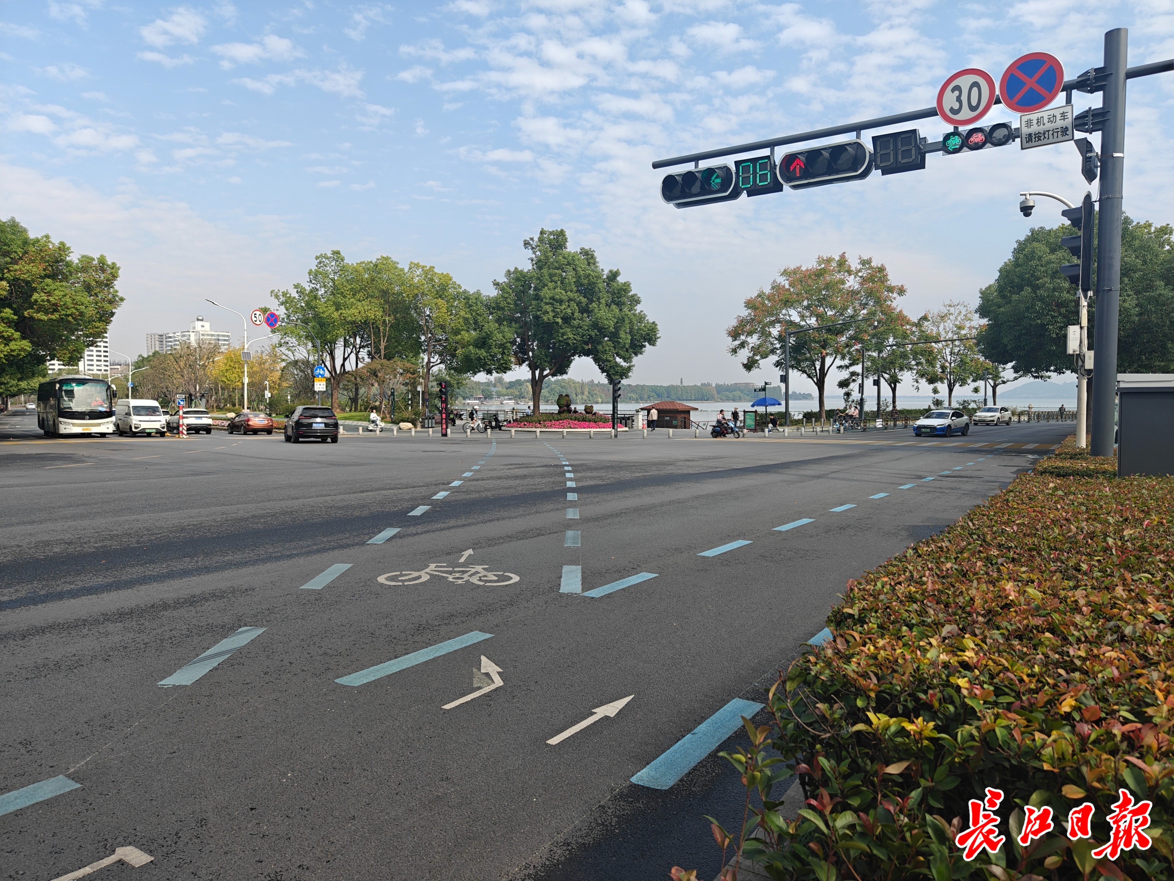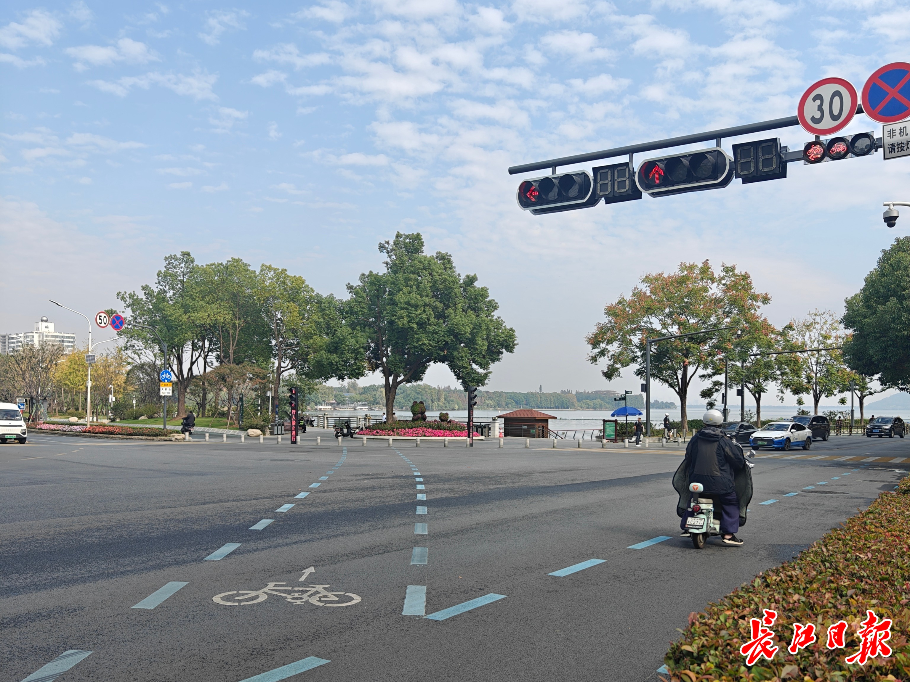骑行爱好者王先生沿着洪山路的非机动车道一路骑行至天鹅路口,看到非机动车左转信号灯变绿后,便顺利左拐到东湖边,开始了环湖骑行。王先生表示:“城市多一些这样的精细化设置,会给骑行者带来满满的安全感。”